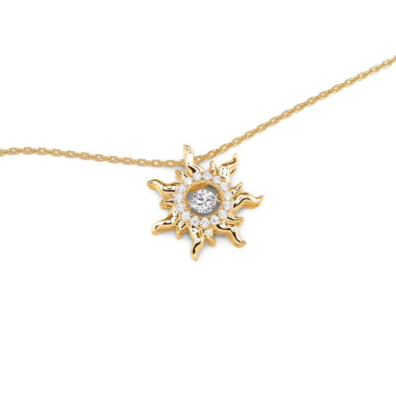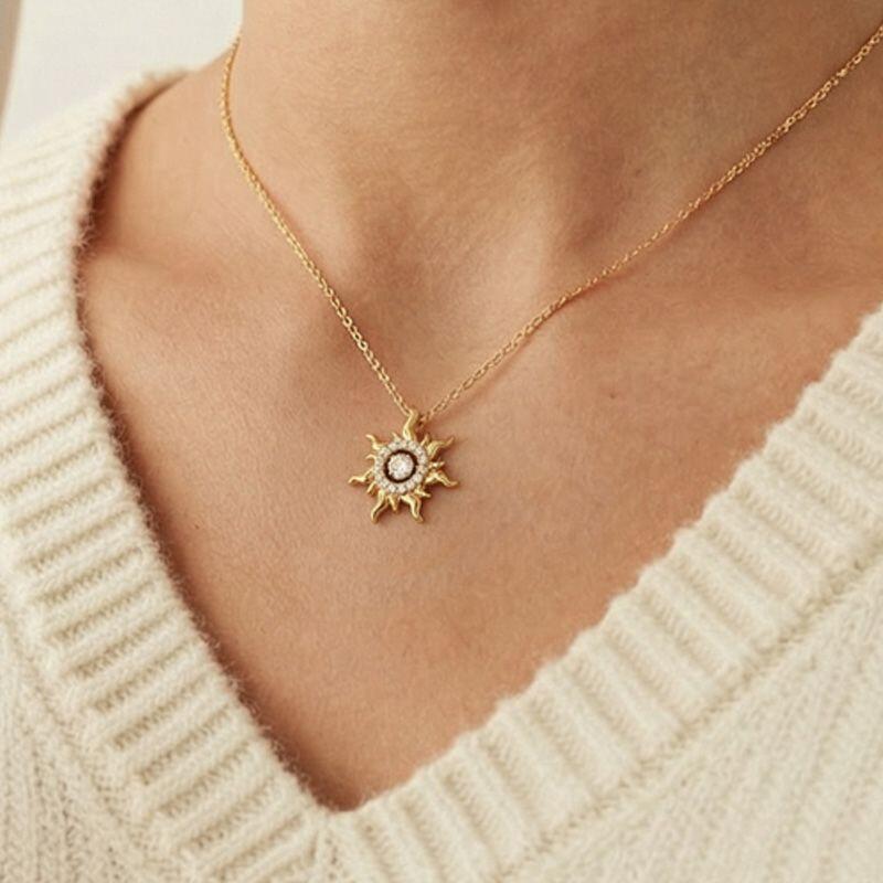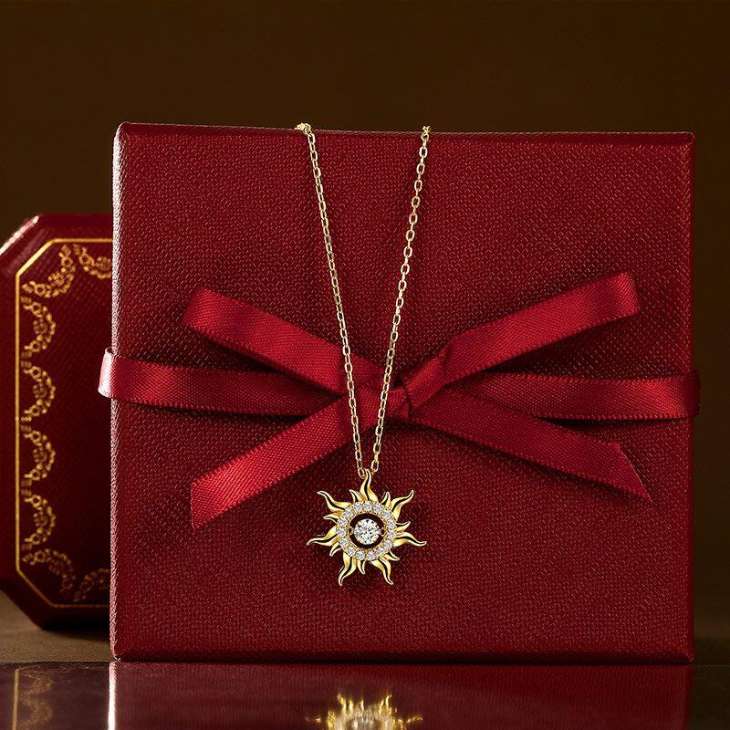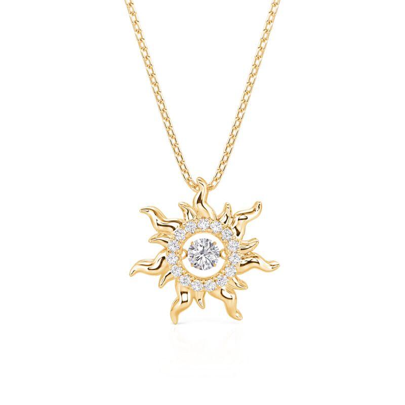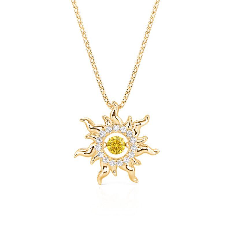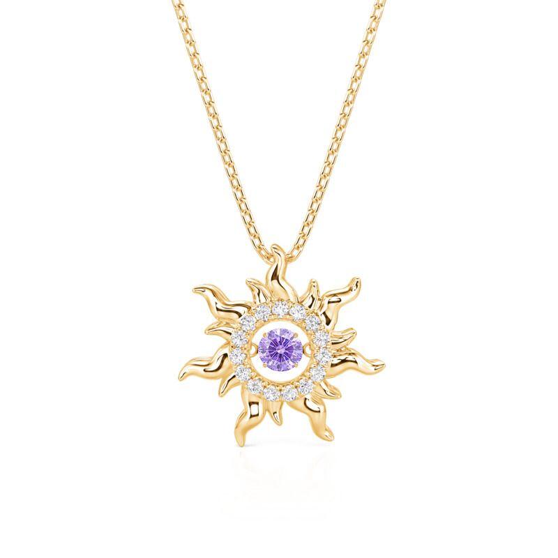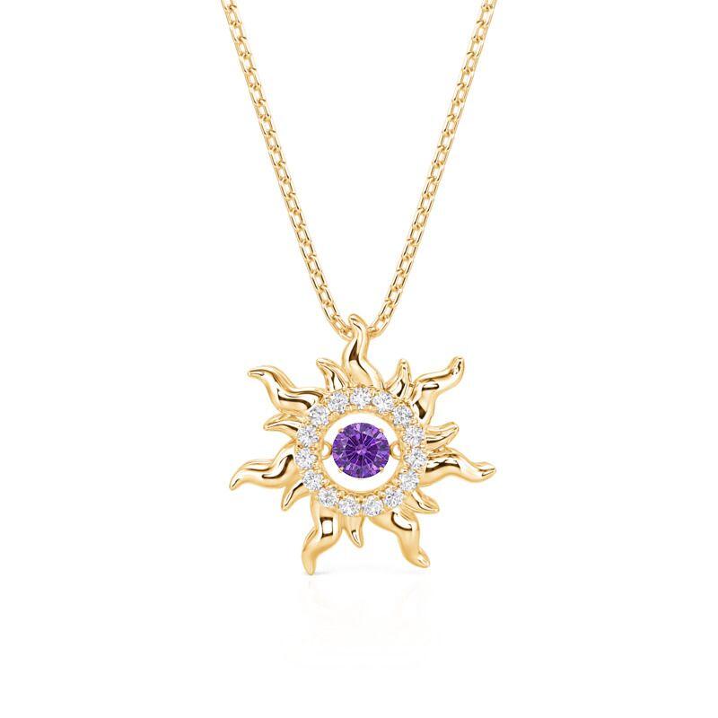 This Jeulia Custom Dancing Birthstone Sun Necklace is crafted from sterling silver, uniting the radiant vitality of the sun with the vibrant essence of gemstones. The sun-shaped pendant features a radiating sunbeam design, each beam carved with three-dimensional coronal eruption-like patterns. At its center sits a freely swaying dancing stone. This dancing stone necklace pairs beautifully with vacation dresses for a sunny vibe, while the moving center stone adds a playful detail to professional attire. Under evening lights, rotating the pendant casts sun-patterned reflections.