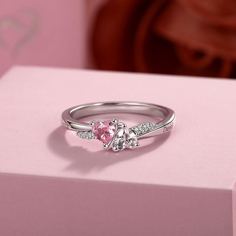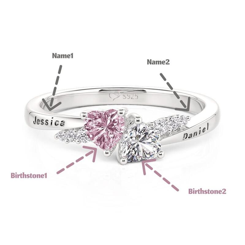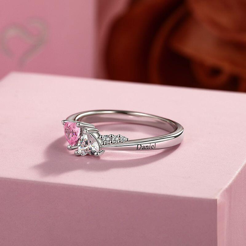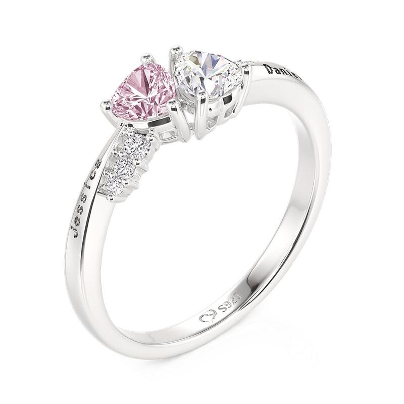 Two heart-shaped stones—customizable to your chosen colors—rest side by side, while names engraved along the band turn this Jeulia 2 heart promise ring into a wearable secret. A tribute to two hearts, one story, and the moments worth wearing every day.