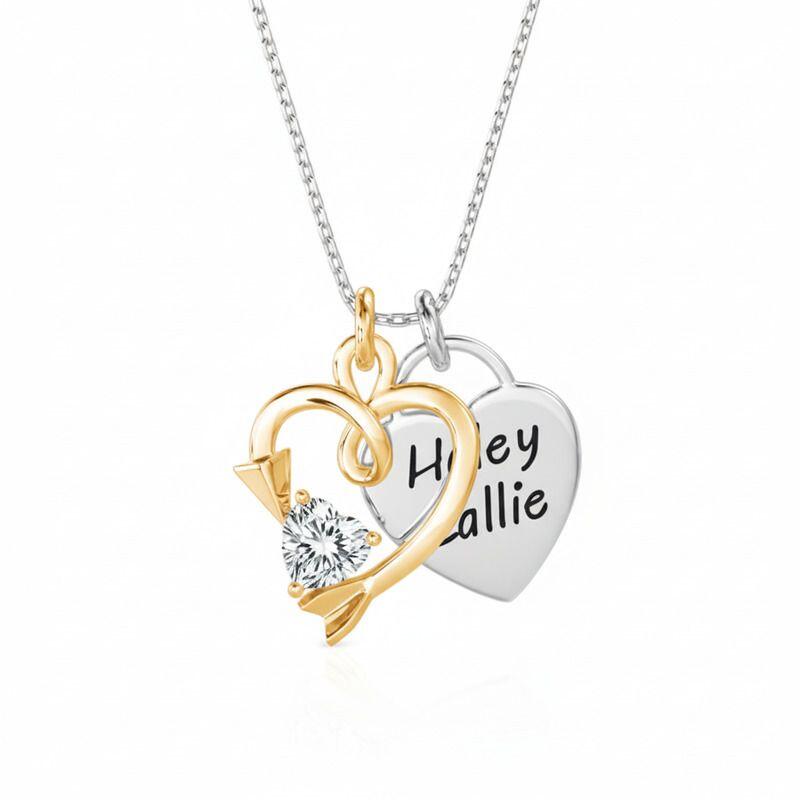 This Jeulia Custom Two-Tone Cupid's Arrow Heart Necklace transforms the romantic symbolism of classical mythology into a wearable declaration of deep affection. A golden arrow curves into a perfect heart shape, its tail set with a customizable heart-shaped birthstone—as if Cupid's arrow has transformed into an eternal mark. The silver heart-shaped tag resembles a secret letter bearing vows, laser-engraved with your chosen name or date. The arrow's fluid lines complement the plaque's minimalist silhouette, while the clash of gold and silver creates a modern yet timeless elegance. Whether as a sweet anniversary gift or a daily accessory imbued with deep affection, this arrow necklace keeps the fable of love close to your heart.