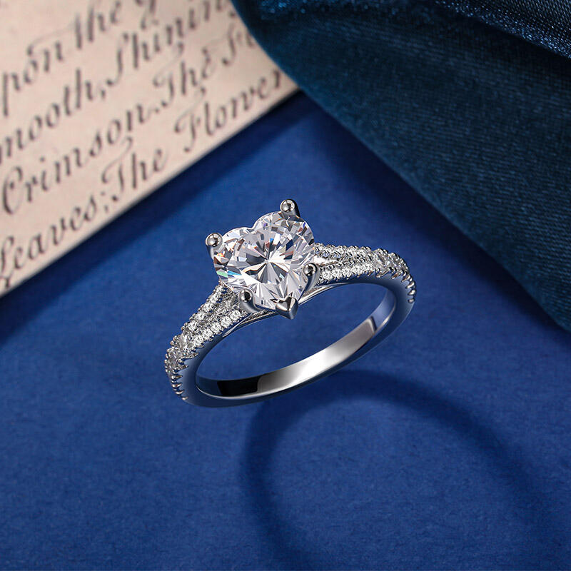 This Jeulia custom heart-shaped eternity ring interprets the depth of love through a minimalist structure. The heart-shaped center stone features a brilliant cut with 64 facets, allowing the fire and brilliance to ripple out in layers like ripples on water. The innovative double-band design features a 15-degree tilt, symbolizing the path of lovers walking side by side. This angle also allows light to pass through the gaps, refracting a brilliant halo beneath the center stone. When worn daily, the interplay of light and shadow on the double bands shifts with every movement. During special moments, such as kneeling on one knee, the heart-shaped center stone appears to float, embodying the essence of love, supported by the double bands.