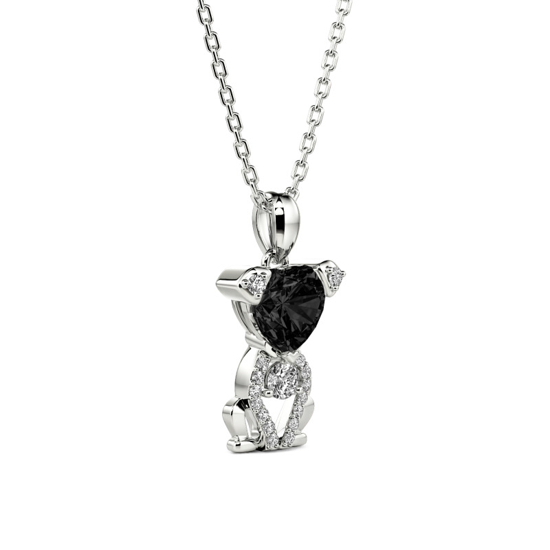 With minimalist lines outlining a well-behaved crouching puppy, this custom heart necklace blends the cuteness of a pet with the sophistication of jewelry. The face of the puppy is set with a heart-shaped main stone, which becomes the focal point of the whole design, symbolizing the fullness of your heart for your beloved pet. The designer has skillfully pave-set a row of round sparkling stones on the puppy's ears and body silhouette, just like the sunlight shedding crystal light on the fur. A larger round gemstone bell dangles from the chest for added interest. The overall design of the heart necklace features smooth minimalist lines, preserving the puppy's cute demeanor while displaying a sense of luxury and fashion. Whether it's to commemorate the companionship of a beloved pet or as a gift for a dog lover, this loving piece of jewelry will warm every moment.