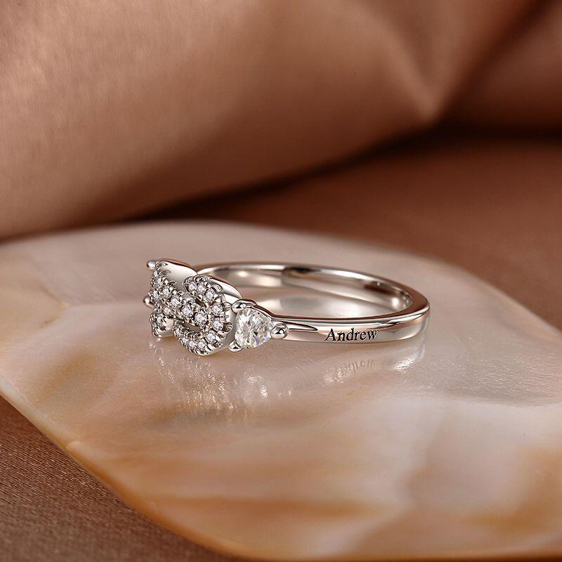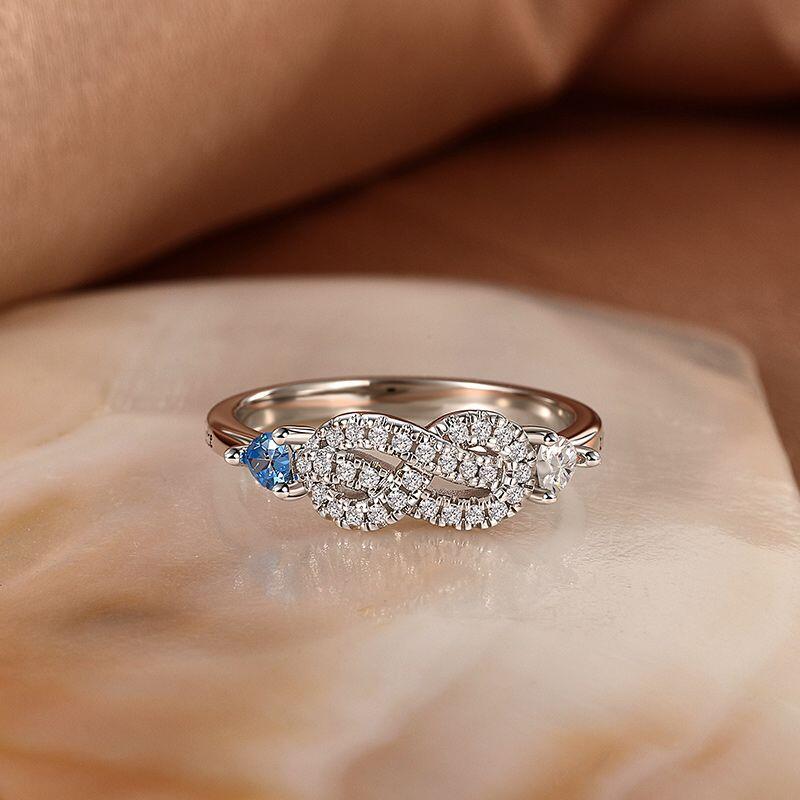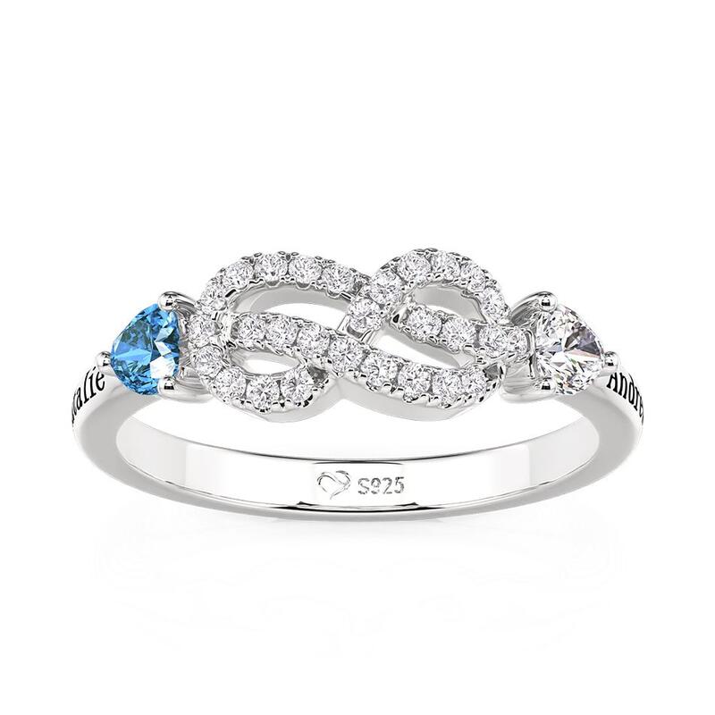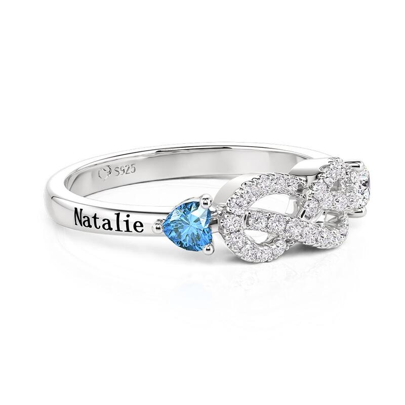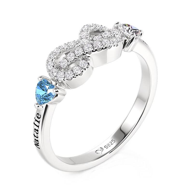 Two heart-shaped stones—customizable as birthstones—nest within a knotted silver band, while names engraved along the sides turn this silver infinity ring into a secret keepsake. This Jeulia Custom Engraved Name Double Heart Birthstone Ring is a symbol of bonds that tie and hearts that choose to stay entwined.