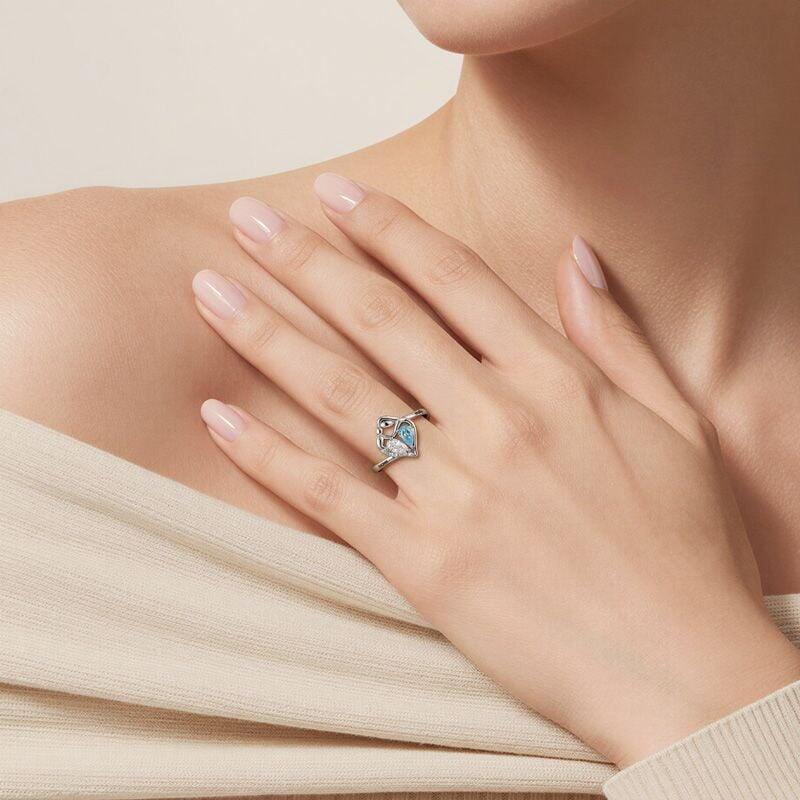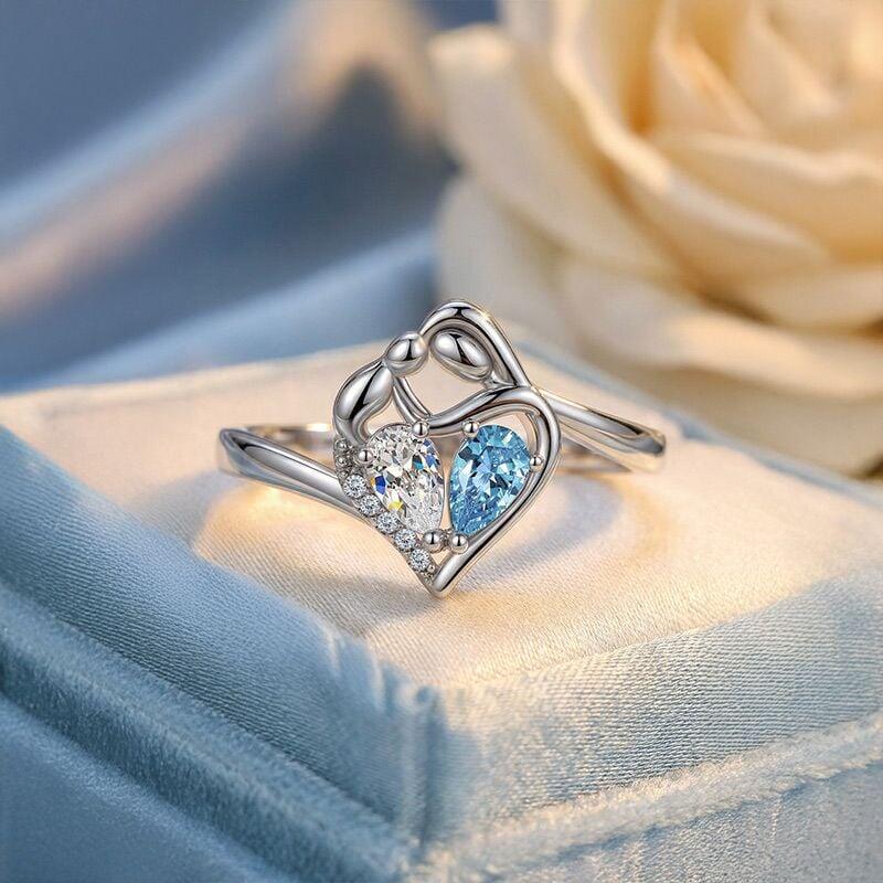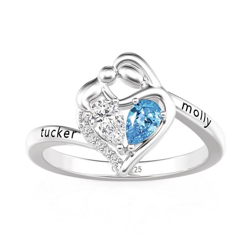 An abstract heart forms where two figures embrace, their bond marked by twin teardrop birthstones that glow in colors you choose. Names along the band complete the story, while pavé edges catch light like tiny whispers—this Jeulia Personalized Mother and Child Ring carries the deepest connection, close where only you can feel it.