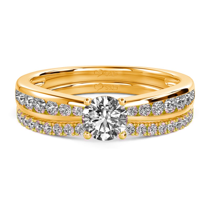 This Jeulia custom simple round engagement ring set with eternity band is classic and elegant. The main ring features a dazzling round brilliant-cut center stone as the focal point, securely set with four prongs to fully showcase its fire and brilliance. The sides of the band are adorned with delicate pavé stones, paired with a tapered band design that widens at the top and narrows at the bottom, making the fingers appear longer and more slender. The secondary ring also features a delicate row of stones, offering a sleek and sophisticated look when worn alone. When paired with the main ring, it creates a layered effect with enhanced brilliance. Whether for an engagement, anniversary, or everyday wear, this eternity ring set perfectly embodies the timeless promise of love.