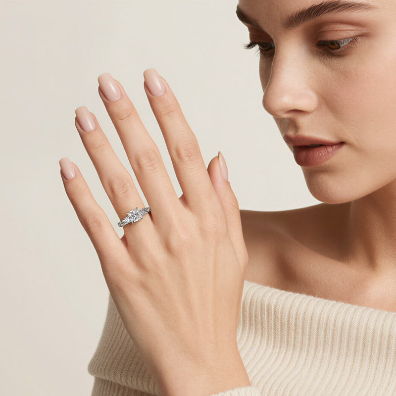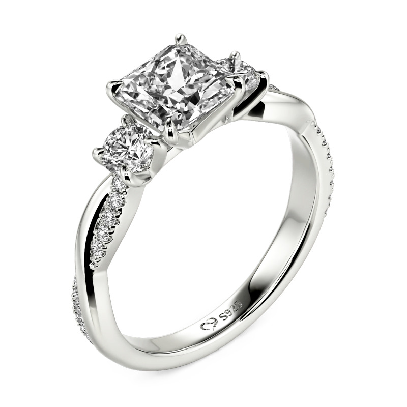 Celebrate the past, present, and future of your love with the Jeulia Custom Three Stone Princess Cut Engagement Ring. At its center lies a breathtaking princess-cut stone, flanked by two brilliant round-cut accents that symbolize your unique journey together. The sterling silver band features a graceful, tapering silhouette, meticulously pavé-set with shimmering stones that add a continuous, sophisticated sparkle. Expertly crafted for a luxurious feel and comfortable daily wear, this three stone engagement ring combines a bold, modern center with timeless, romantic details. Whether marking a significant proposal or a cherished anniversary, this luxury ring serves as a stunning and enduring tribute to a love that grows more brilliant with every passing moment.