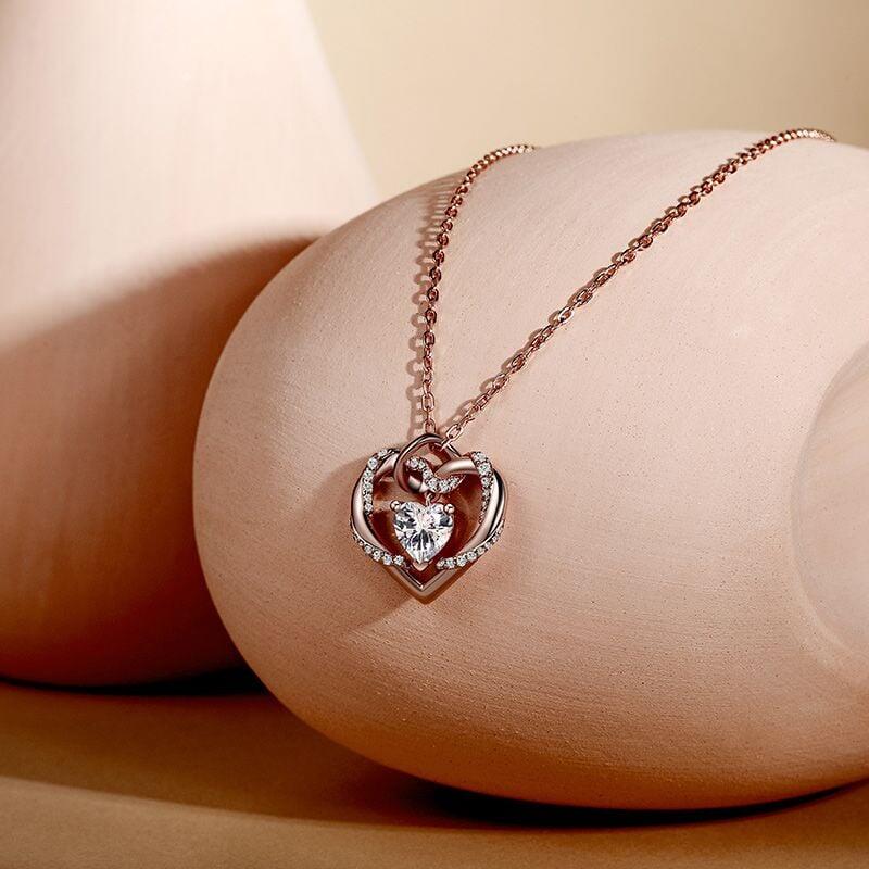 This Jeulia custom heart necklace showcases a captivating design where two heart-shaped frameworks intertwine, their graceful curves merging into an infinity symbol that represents endless love. Crafted in polished sterling silver, the outer heart features twisted, fluid lines adorned with pavé-set stones, while a brilliant heart-cut center stone floats within, creating luminous depth and dimension. Fully customizable to reflect your personal story, this three heart necklace blends heartfelt symbolism with intricate artistry—perfect for special moments or everyday wear as a radiant expression of lasting connection.