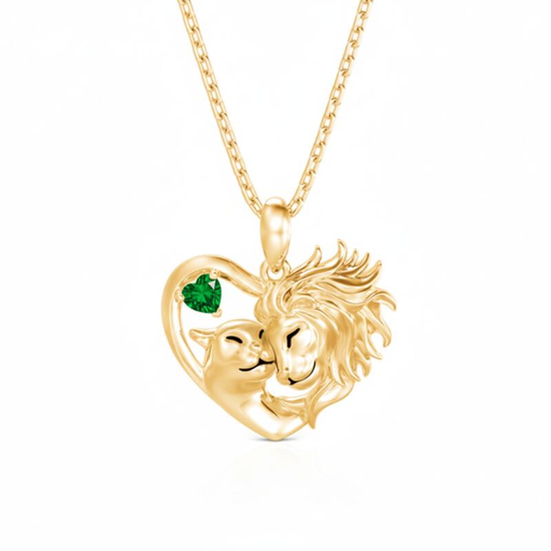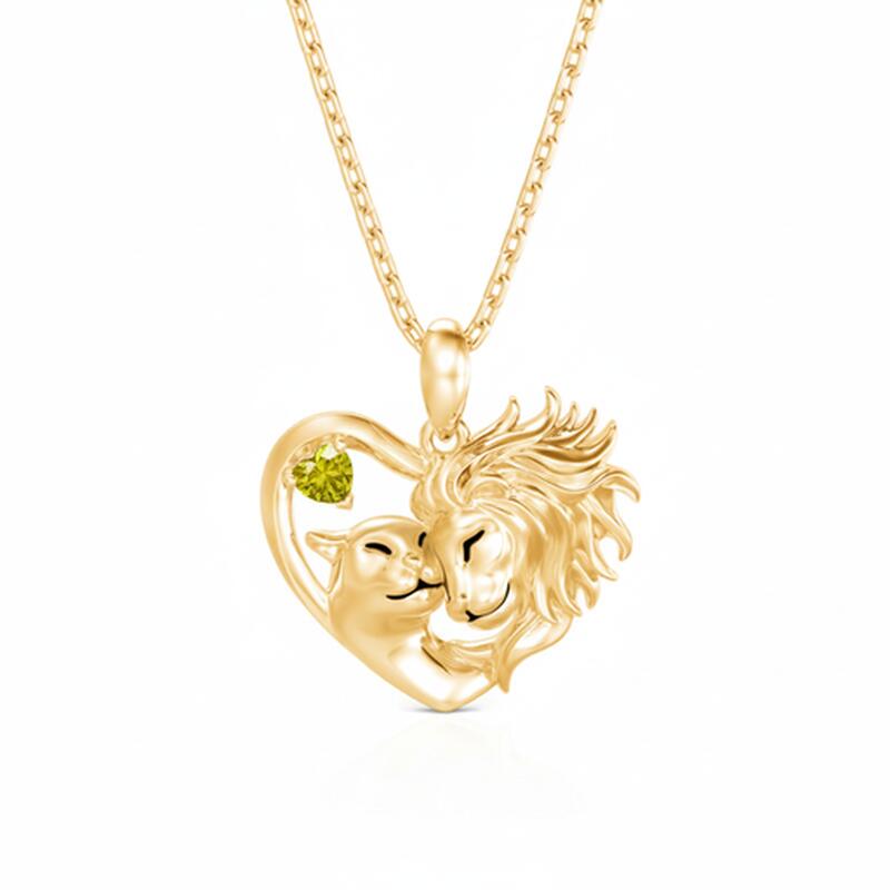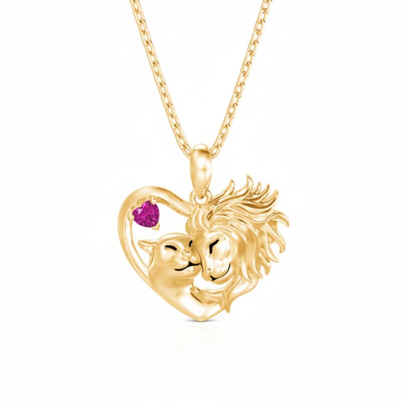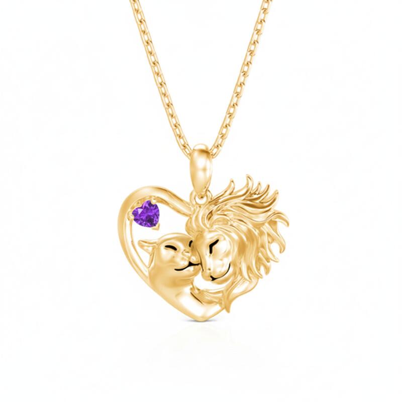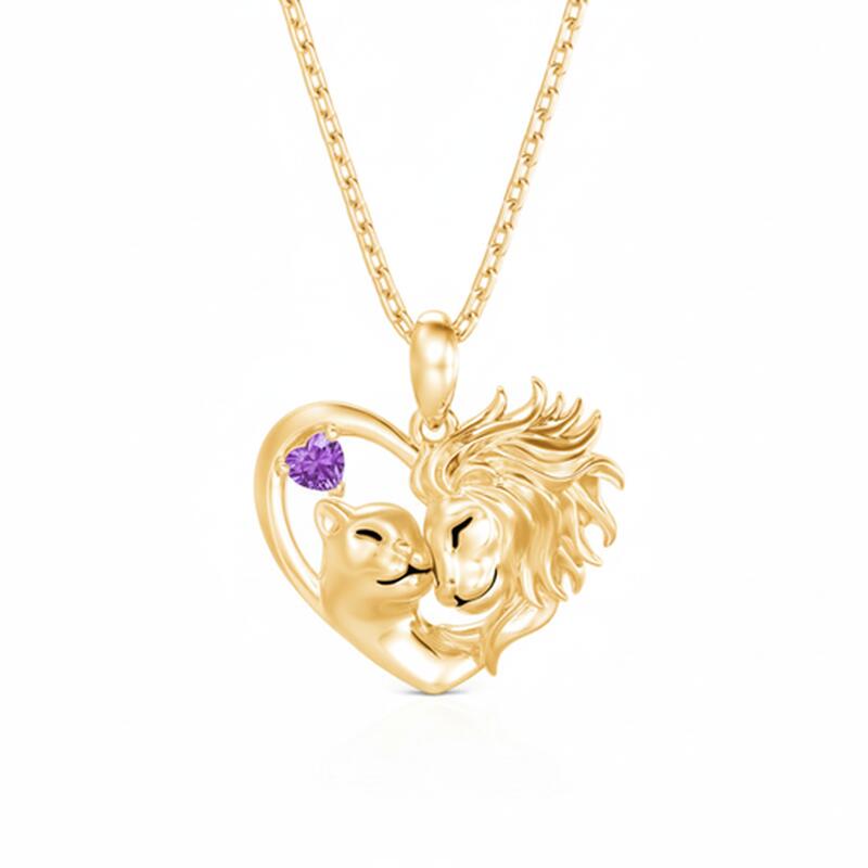 This Jeulia custom “Whisper Lion” birthstone necklace captures a tender scene of a lion and lioness nestled together within a heart-shaped silhouette. Intricately carved fur textures and affectionate poses evoke nature's gentle guardianship. A freely customizable birthstone heart-shaped center stone adorns the upper left corner, symbolizing love as steadfast as rock. Its brilliant glow harmoniously complements the surrounding lion silhouettes. The necklace chain features a minimalist design, allowing the heart pendant to drape naturally when worn. The tender embrace of the two creatures and the sparkling heart stone together convey profound themes of family, loyalty, and romance. Perfect as a gift to cherished ones, symbolizing protective affection, this gold lion necklace also serves as an extraordinary accessory for daily wear, showcasing individuality and warmth.