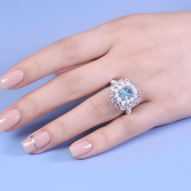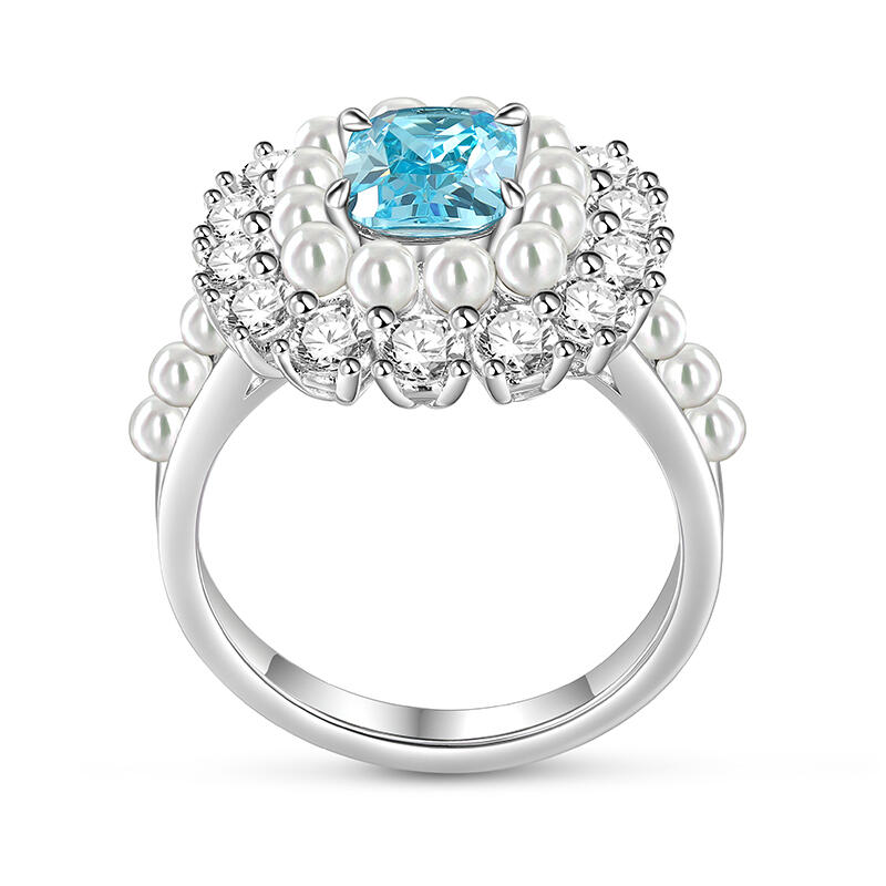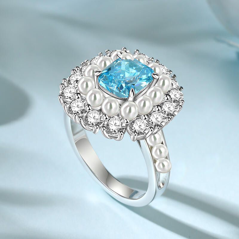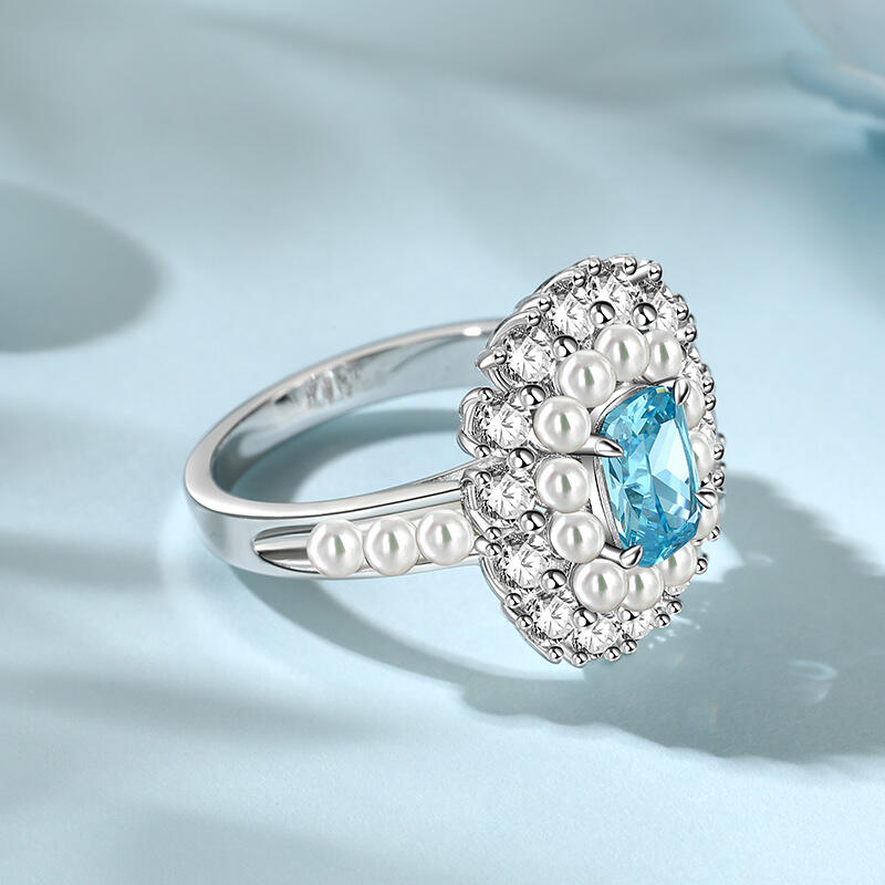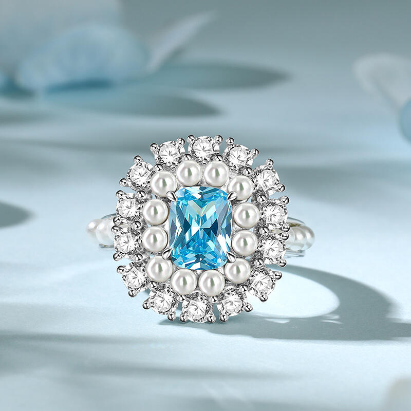 This beautiful sterling silver double halo pearl aquamarine ring showcases a unique design and elegance. It features a pearl delicately surrounding the central Sohae sapphire, creating a mysterious yet elegant atmosphere. The design of the ring is full of artistry and subtlety, with each pearl and sapphire radiating its own light, blending perfectly with the silver material to present a unique aesthetic. Whether worn for everyday wear or as a sophisticated adornment for important occasions, this pearl aquamarine ring will add confidence and glamor to your wardrobe, making it an indispensable fashion accessory.