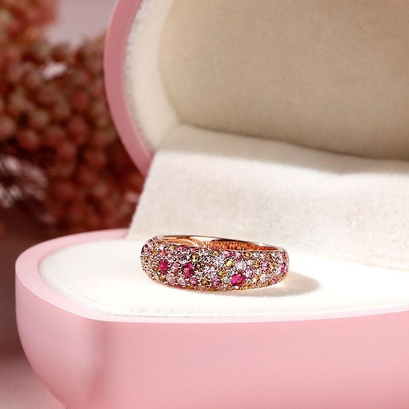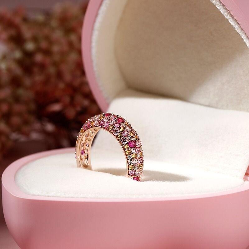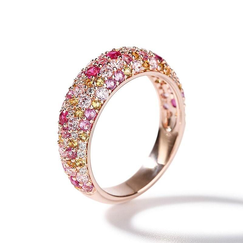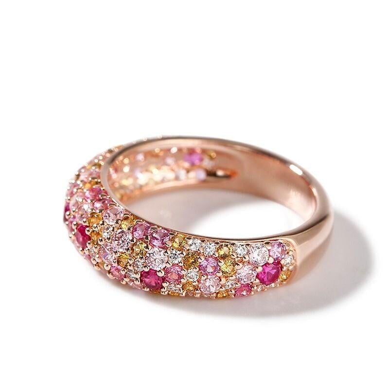 This ring color is inspired by the beauty of nature which abounds with affluence of colors from the delicate pinks of the flowers, yellows of beaches and whites of clouds. Filled with the colors you'd find in a whimsical flower garden, this multicolored ring is so delightful! Crafted in sterling silver, every stone shines in a brilliant display of color and light on this ring. This beautiful harmonious blend will radiate your feminine side while revealing your beautiful personality.