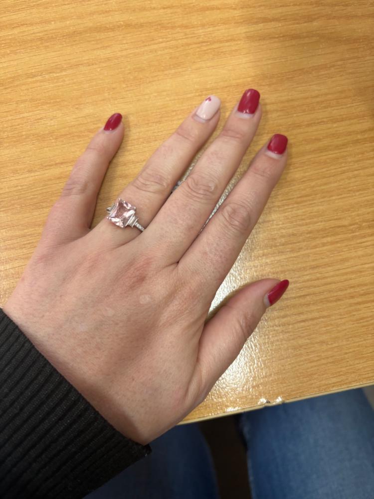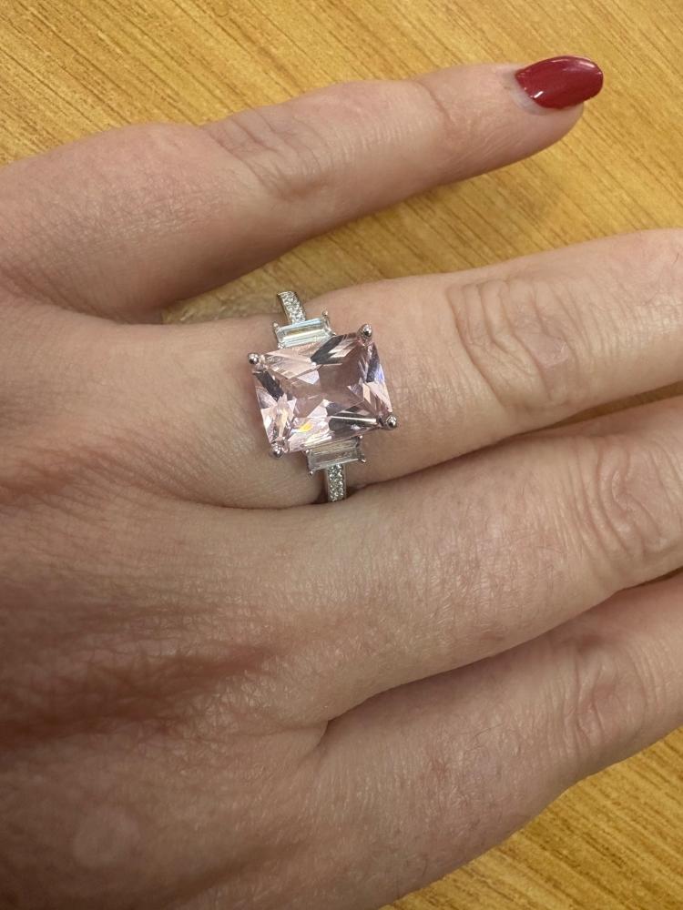 Simplicity with a classic touch, this gorgeous emerald-cut morganite ring is the perfect new addition to your ring collection. it features a sterling silver band in a 4-claw setting, gently complimenting the soft pink hue of the morganite stone. Wear it as a unique engagement ring or just as a beautiful accessory to elevate your outfit!