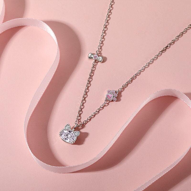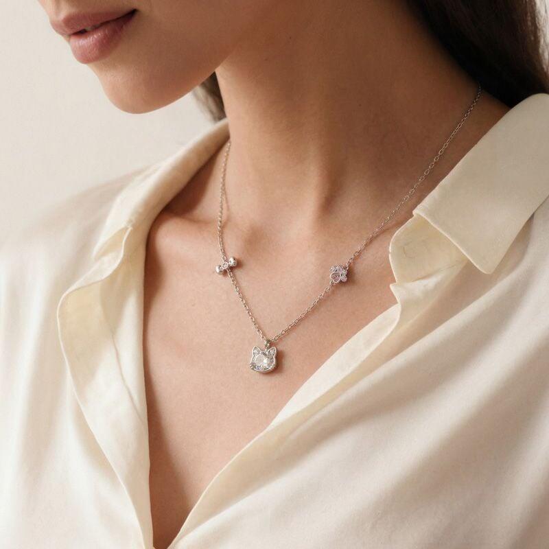 Crafted with care from sterling silver, this Kitten Paw Print Bow Fashion Necklace blends the playful charm of a kitten with the sweet elegance of a bow around your neck. The pendant features a kitten formed by combining a white oval stone with a triangular stone. The oval stone forms the kitten’s round face and body, while the triangular stone playfully takes the shape of perky ears, as if the kitten were peeking out to look around; Adorned on the side with a pink bow and delicate cat paw accents, the design adds a touch of sweet playfulness to the overall look. The cat pendant sways gracefully between the collarbones with every movement, as if a mischievous kitten were playing around your neck. This sterling silver cat necklace is perfect for pairing with cute outfits to showcase a youthful spirit, or for adding a touch of playful charm to simple everyday looks. Whether as a heartwarming gift for a cat lover or a sweet treat for yourself, this cute necklace allows the wearer to feel the comfort and joy of being surrounded by adorable pets at all times.