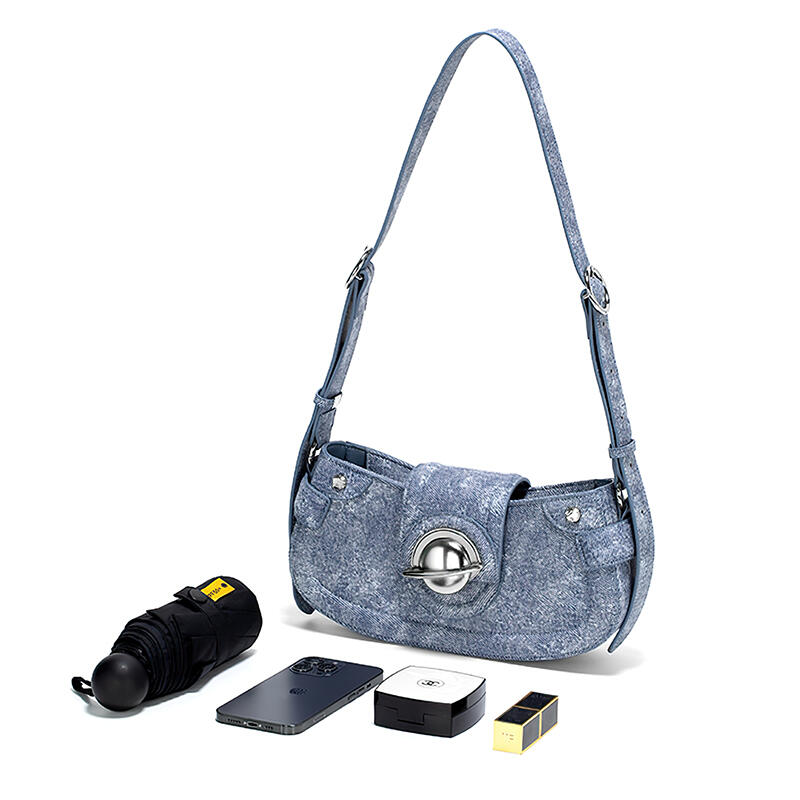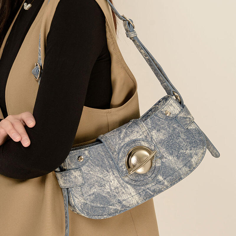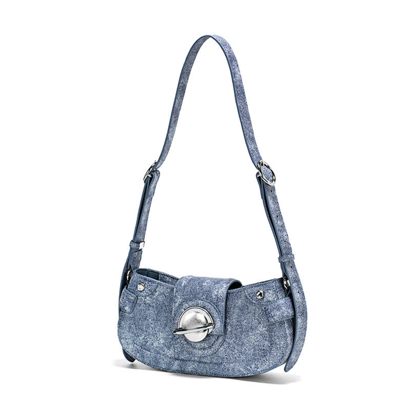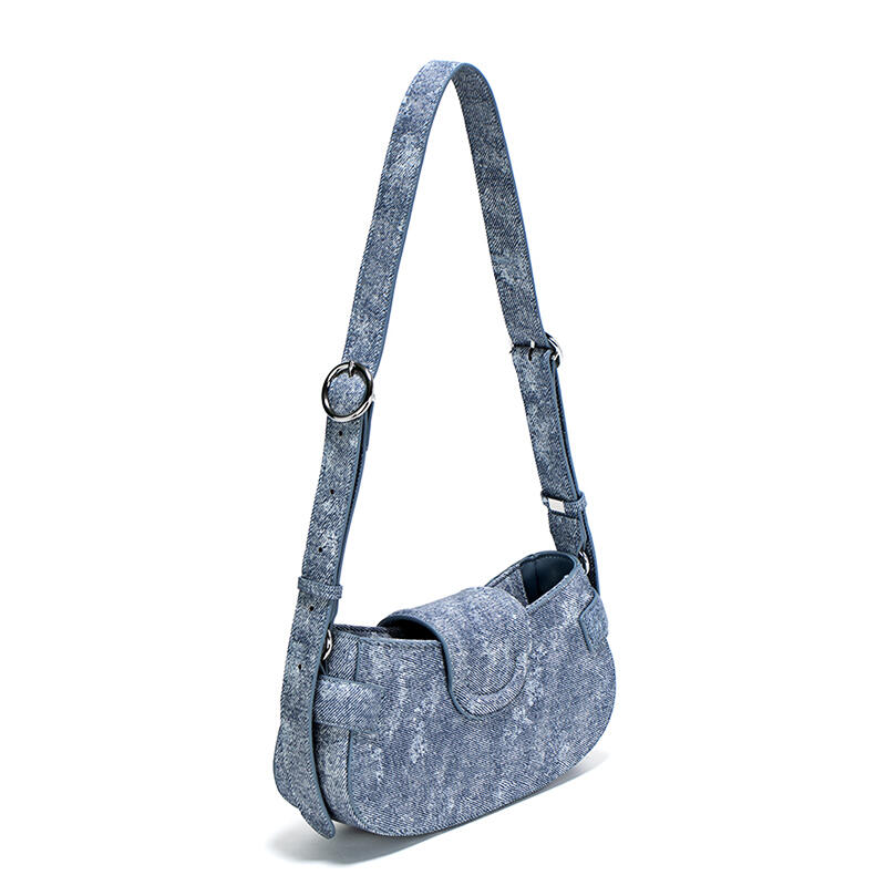 Jeulia Faux Denim Half Moon Bag Vintage Shoulder Bag with Silver Buckle