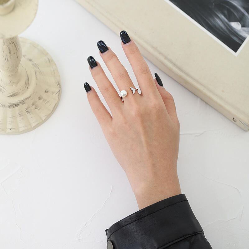 At one end of the open silhouette rests a luminous white pearl, its pristine beauty radiating timeless grace. The other end showcases a meticulously detailed fish tail, adorned with the iridescence of mother-of-pearl. This delicate union of textures and tones creates a harmonious dance between the lustrous silver setting and the natural allure of the ocean-inspired elements.