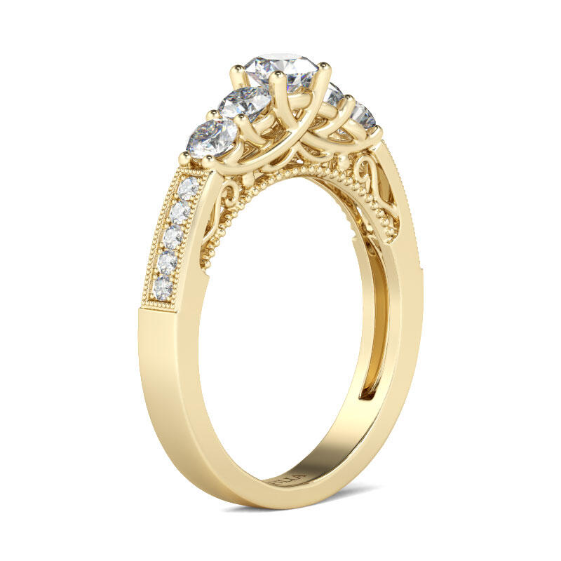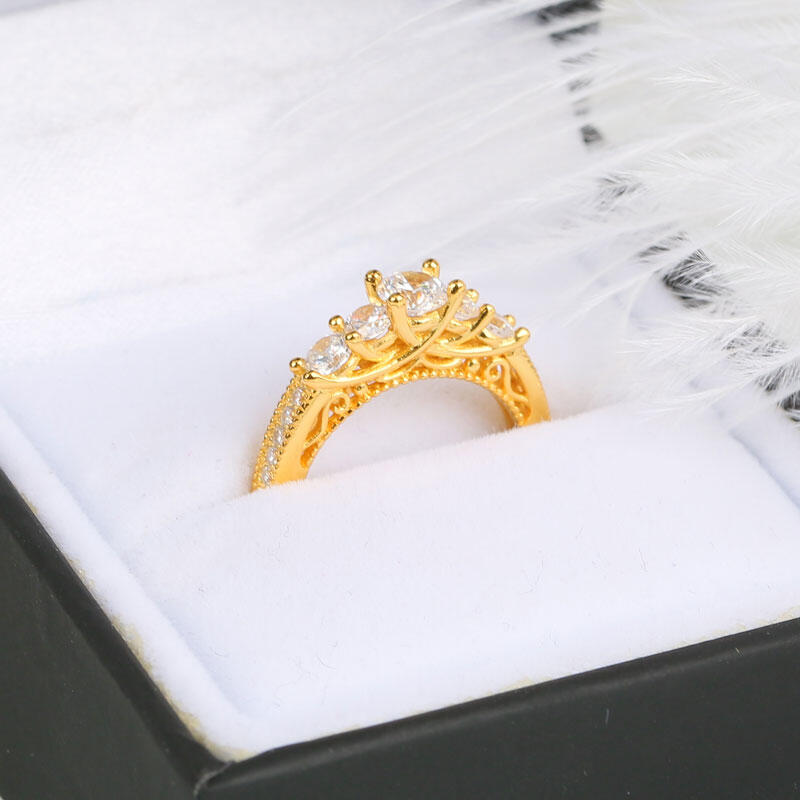 What does it mean to fall in love? It means you have found the one that makes your heart melting. You will join your lives together forever and pledge to always be there for each other. This ring is the perfect symbolic embodiment of your romantic love story. Five round cut stones shimmer at the center of this design, while additional stones line the ring's shank for a touch of sparkle. This elegant and timeless look blends sophistication with radiance and sparkle.
