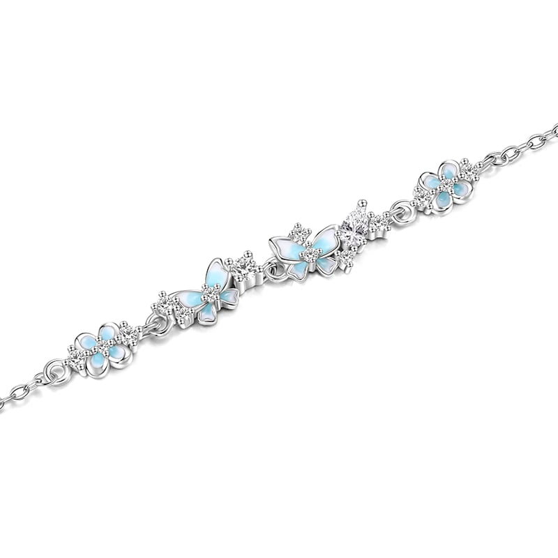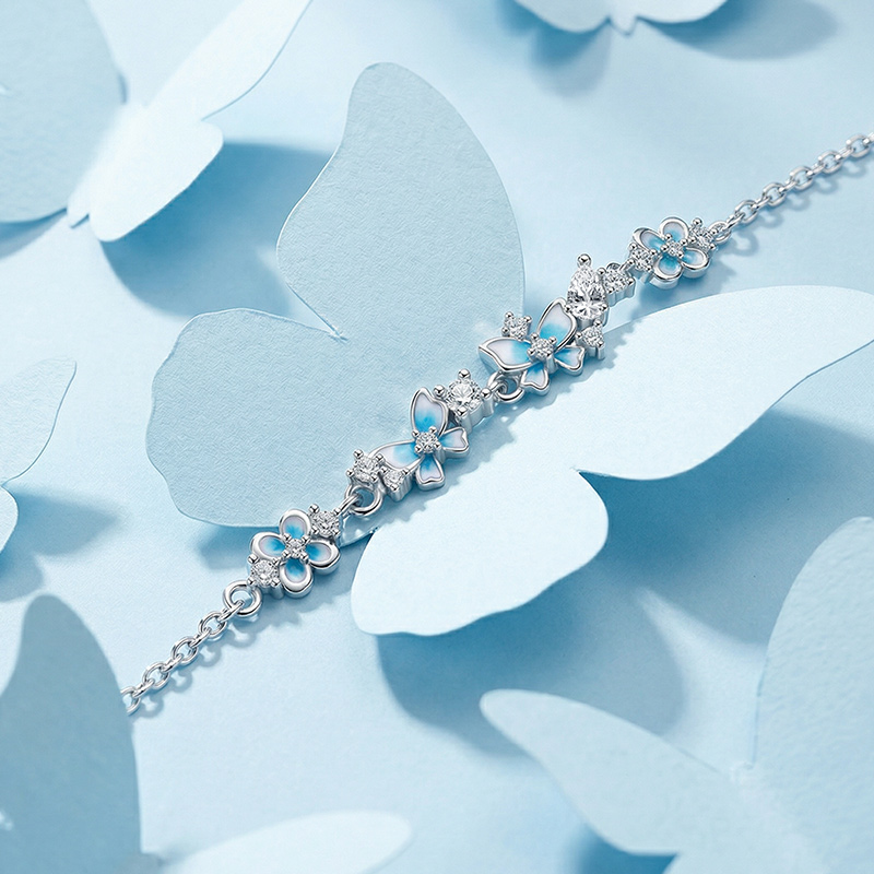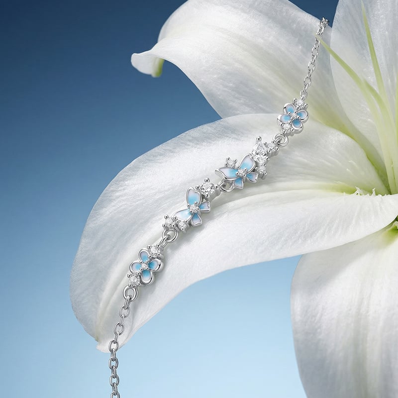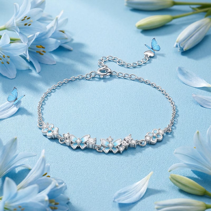 This enchanting spring-themed bracelet from Jeulia brings blooming flowers and fluttering butterflies to life, crafted in polished sterling silver. Each motif is inlaid with luminous material that glows softly in the dark, adding a magical touch to everyday wear. The delicate floral and butterfly details are integrated along a lightweight chain, creating a graceful silhouette that moves beautifully with the wrist. Ideal for nature lovers and fans of playful elegance, this flower and butterfly bracelet captures the freshness of spring—perfect for daily wear, Mother’s Day, birthdays, or any celebration of new beginnings.