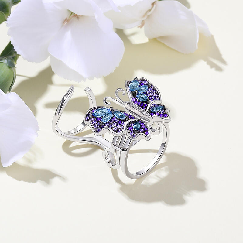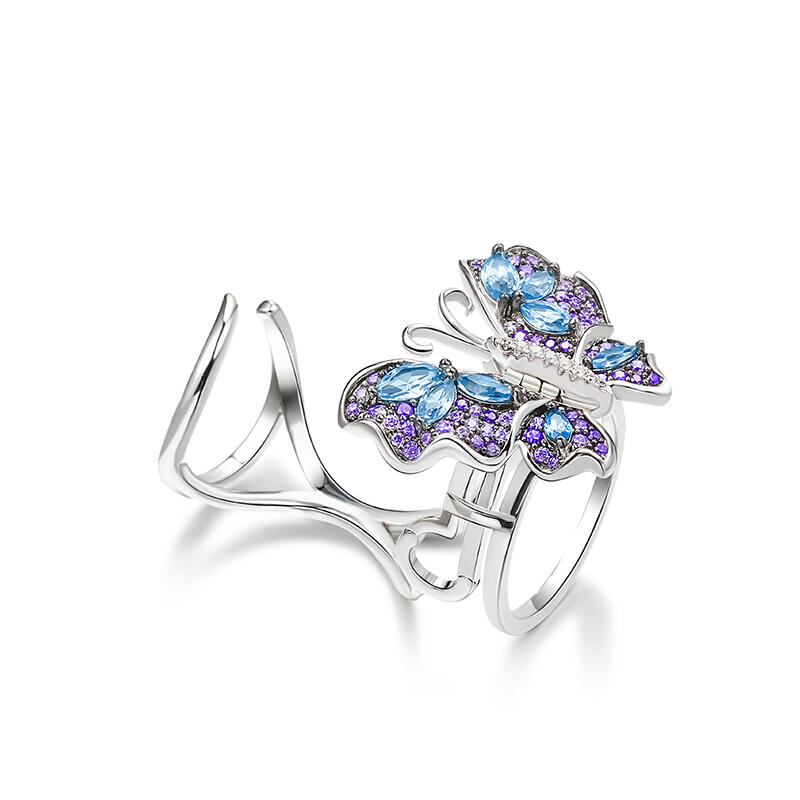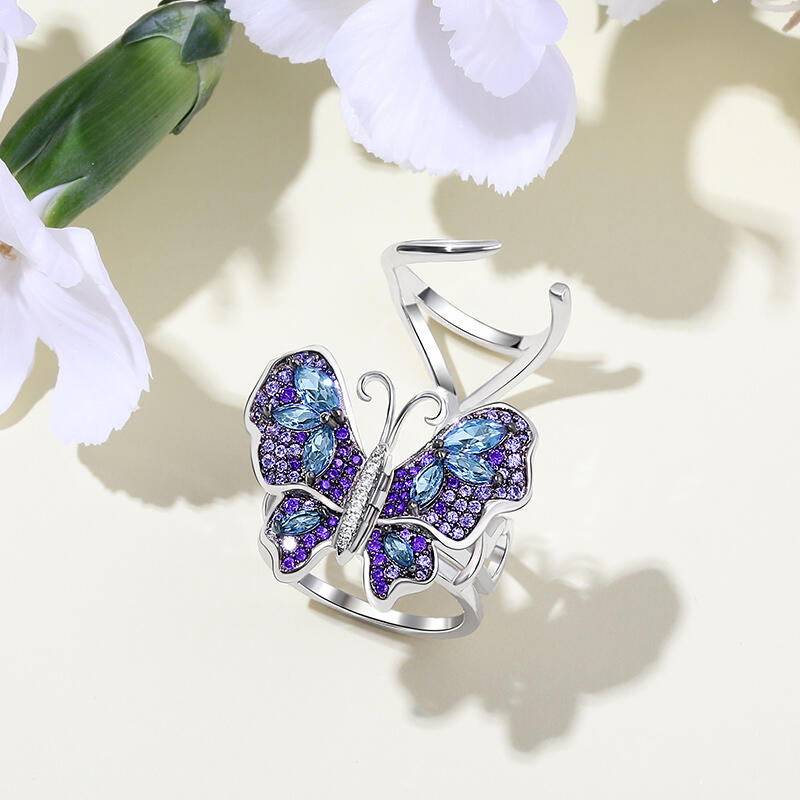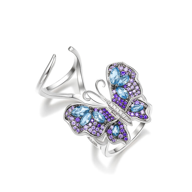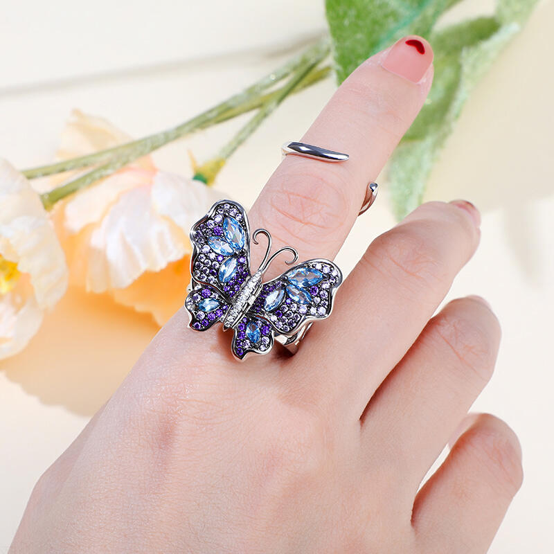 Our gorgeous flying butterfly ring, with its distinctive workmanship, pays tribute to the glamour and elegance of this creature. Through its graceful movement between your fingers, it recreates the fluttering charm of wings and adds unique enchantment to your femininity. Combing beautiful colors and asymmetry, this dazzling piece highlights eight brilliant marquise-cut blue stones, and smaller round stones in purple paved on wings. The multi-colored butterfly, fashioned in fine sterling silver, kindles the beauty of nature in movement. Let this bewitching ring take you to an unusual flight!