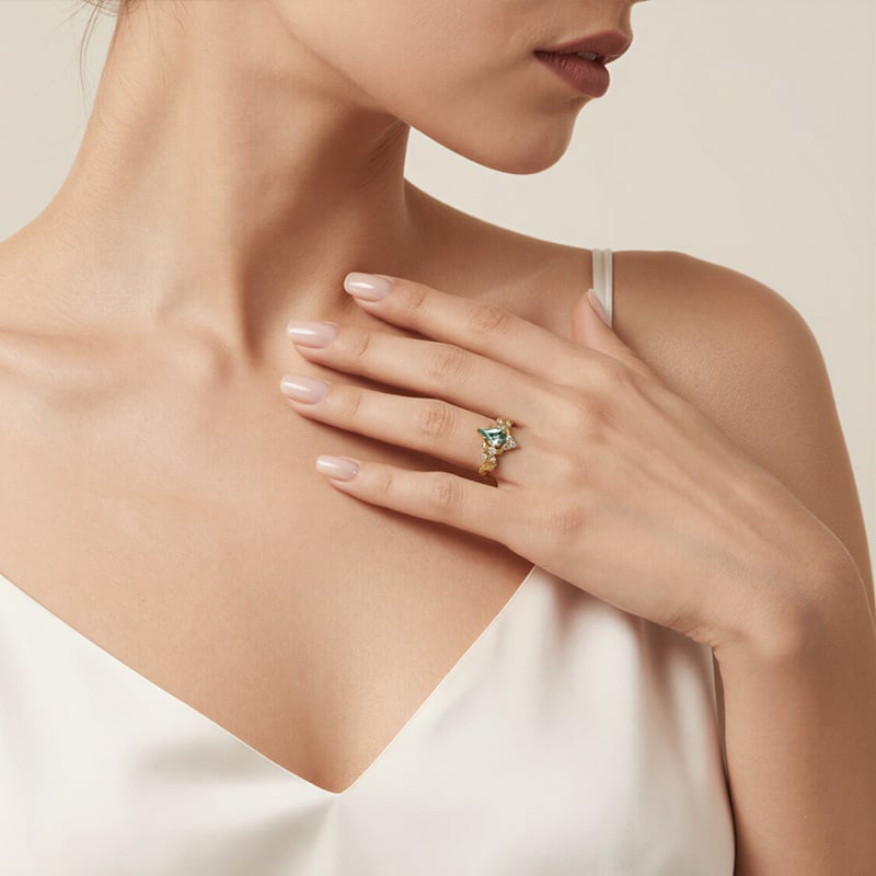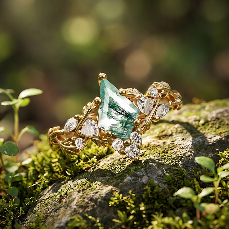 Crafted from 925 sterling silver with gold plated, this gold moss agate engagement ring seamlessly blends the poetry of nature with the gemstone’s unique texture. The center stone features a rare kite-shaped moss agate, whose slender and sharp contours resemble autumn leaves drifting to the ground. The natural bluish-gray moss-like patterns within the stone, set against the warm luster of the gold, evoke a hidden map of a secret realm, faintly visible through the morning mist in the woods. The band is encircled by intricately carved branches and leaves, with clearly defined, flowing veins that extend naturally from either side of the center stone and intertwine to form a vine-like base, as if the entire ring were growing from the branches of an ancient tree. Perfect for couples seeking something truly unique and drawn to the essence of the earth, this nature inspired engagement ring allows a promise from the ancient forest to bloom at the tip of your finger.