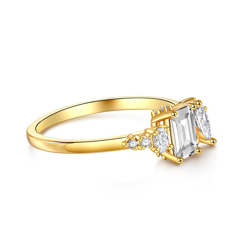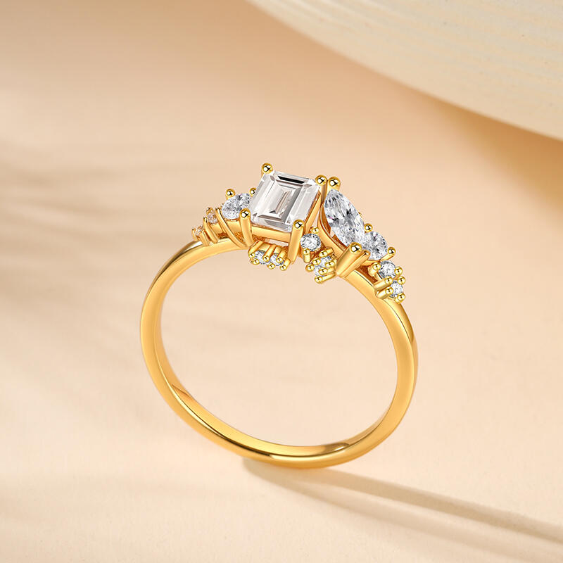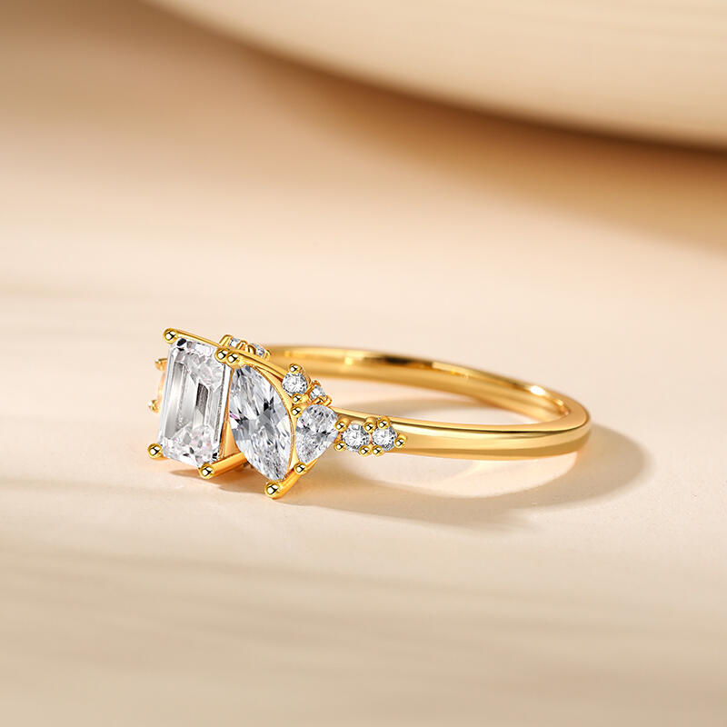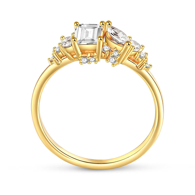 The gold tone ring's focal point is a cluster of stones of various shapes, create a harmonious and eye-catching display. These stones drawing the eye and adding a touch of glamour to the overall design. The cluster sterling silver ring arms are smart and slender, crafted from high-quality sterling silver that is both durable and beautiful. Their sleek lines complement the cluster of stones, emphasizing the yellow ring's elegant and noble atmosphere.