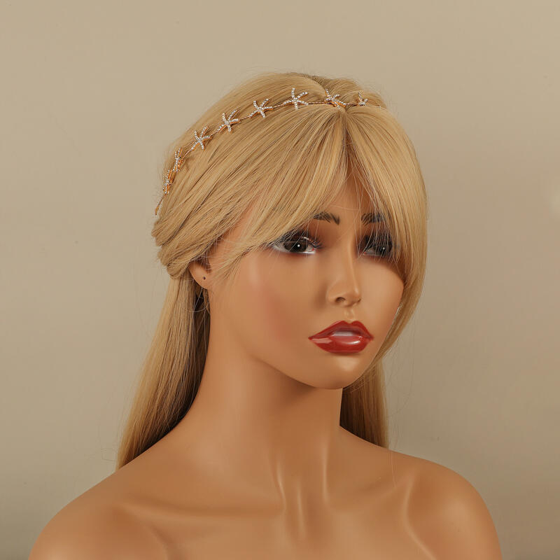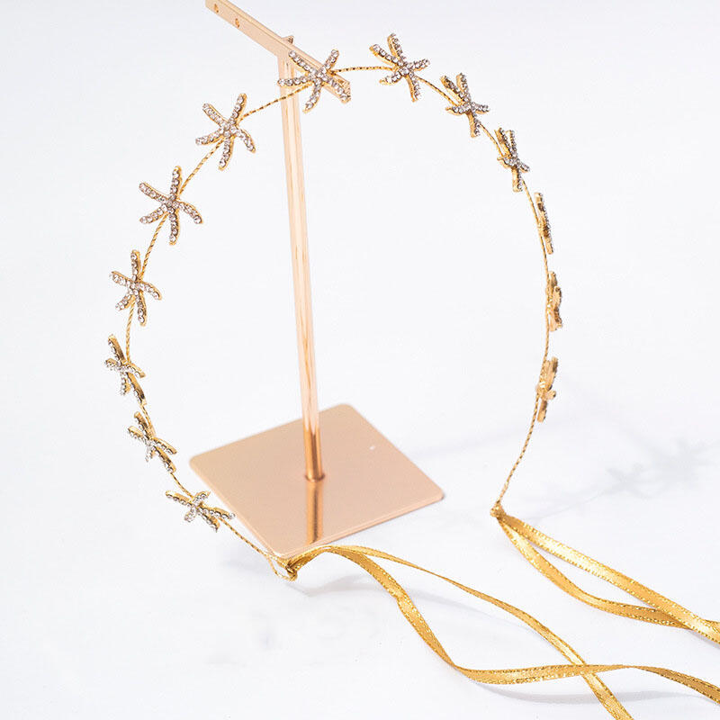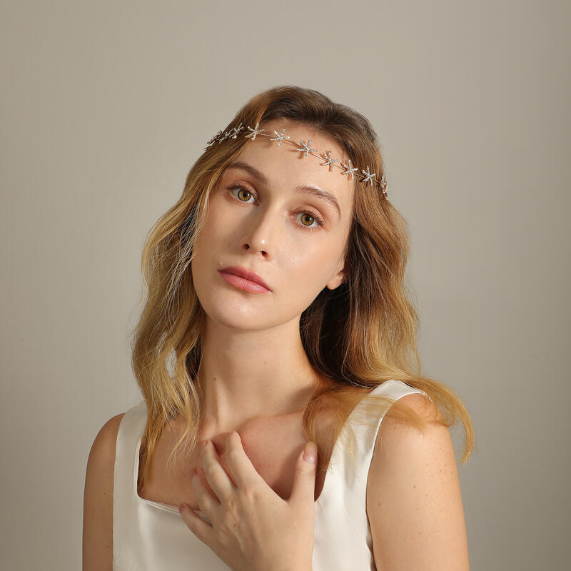 This sparkling gold tone starfish bridal headband, a stunning accessory to elevate your wedding day look. Crafted with intricate details, this headpiece features elegant starfish design elements in a luxurious gold tone finish. Inspired by the beauty of the sea, this headband adds a touch of whimsical charm to any bridal ensemble. Perfect for beach weddings or any bride looking to add a touch of glamour to her special day. Make a splash with our gold tone starfish bridal headband and shine like a star on your wedding day.