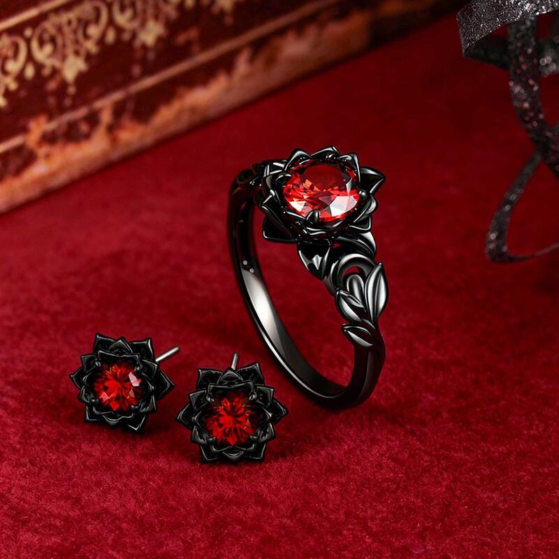 Jeulia Gothic Black Lotus Ring and Earring Set