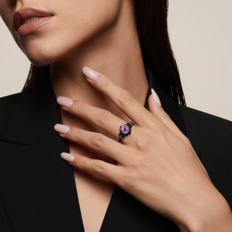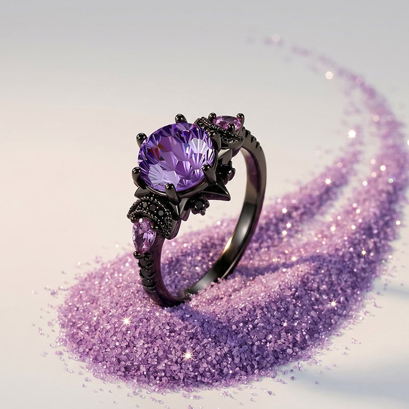 This Gothic-style Star Moon Firework-Cut ring captures the mystery of the dark night and the magic of fireworks on your finger. Set at the center is a purple firework-cut main stone; its unique radiating facets resemble purple fireworks suddenly bursting across the night sky, dazzling and striking. Against the backdrop of the black band, it appears even more mysterious and magnificent. Flanking the center stone are two symmetrical crescent-shaped accents, creating a striking contrast of light and shadow with the stone’s dazzling brilliance—as if two cool crescents were encircling a burning purple star. The overall design combines the dark, intense allure of Gothic aesthetics with the romantic poetry of moonlit fireworks.This black ring is perfect for pairing with edgy fashion at parties or formal dinners, transforming your fingertips into the most dazzling and mysterious sight in the night. Whether as a statement of individuality for everyday wear or the finishing touch for a special occasion, this purple ring allows the wearer to exude a unique and captivating aura.