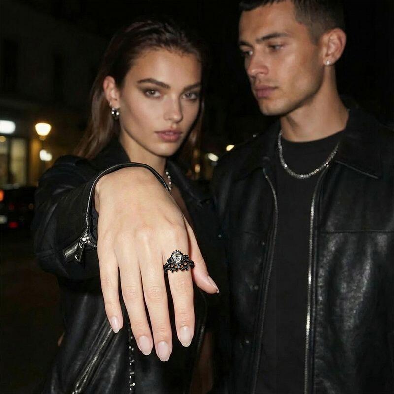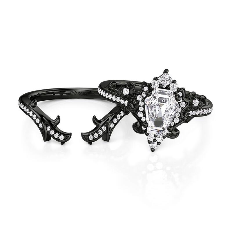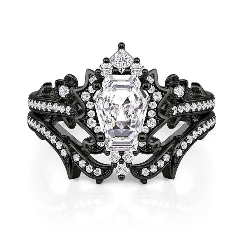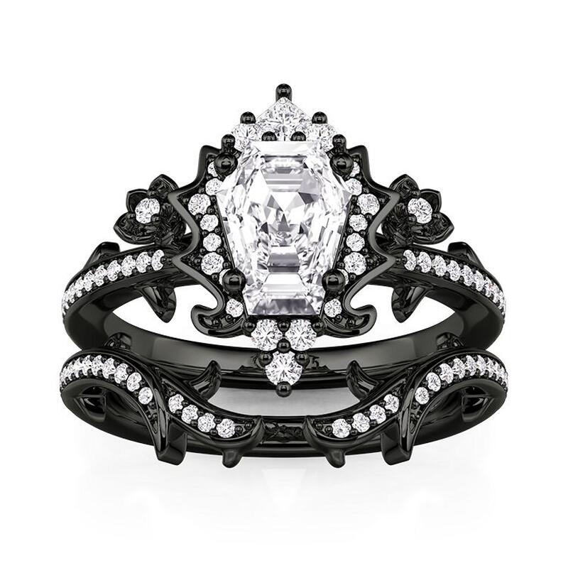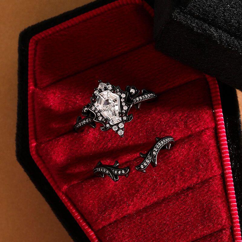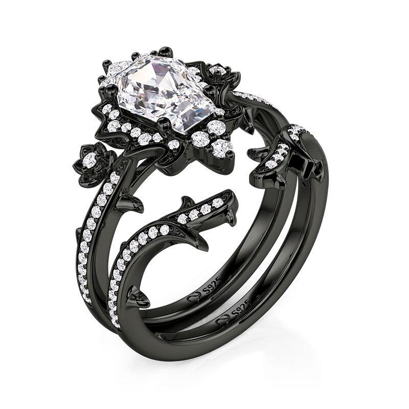 A coffin-cut stone centers this darkly romantic set, framed by matte black metal roses and thorny vines scattered with micro-stones. The enhancer band echoes the theme with elegant brambles—wear this Jeulia Black Coffin Ring Set layered for a bold Gothic narrative, or alone for a hint of shadowed elegance.