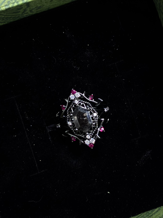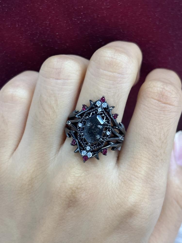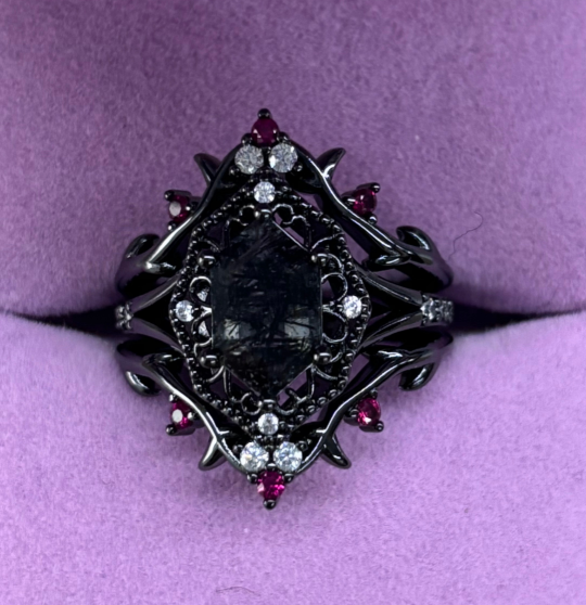 Embrace darkly romantic elegance with the Jeulia gothic thorn hexagon black rutilated quartz bridal set. Featuring hexagon - cut black rutilated quartz center stones, adorned with intricate thorn elements and gothic detailing, this black rutilated quartz ring set blends edgy style and bridal sophistication. Perfect for those who love a bold, unconventional bridal look, this black ring set is a striking duo that celebrates gothic charm and enduring commitment with every dramatic glimmer.