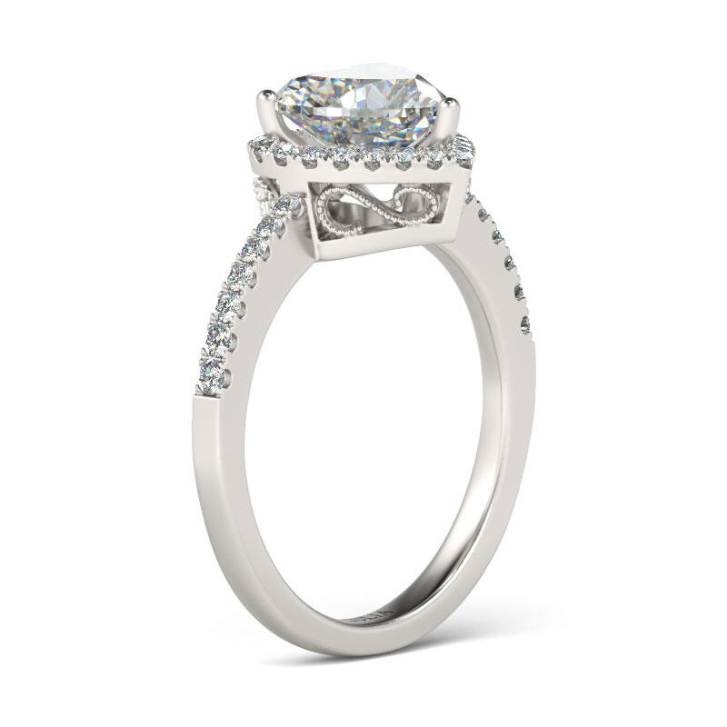Express all the love you hold in your heart with this exquisite ring. the engagement ring showcases a magnificent heart-shaped center stone. A halo frame of smaller round stones wraps this center stone in a sparkling embrace, while additional stones line the ring's shank. On that special day, when you ask for her hand in marriage, honor her with this exquisite ring.