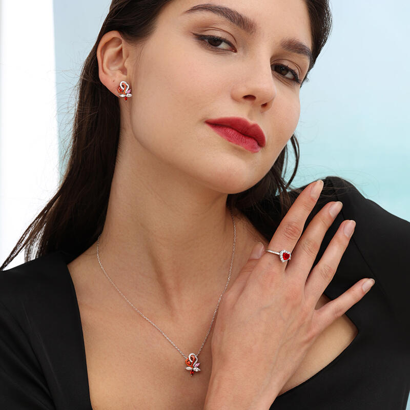 This exquisite ring perfectly portrays your love and commitment because it's designed with love in mind. This sweet design features a sparkling heart-shaped red center stone wrapped in a halo frames of smaller round stones. Additional stones adorn the shank to complete this elegant look. This engagement ring is a symbol of your everlasting love.