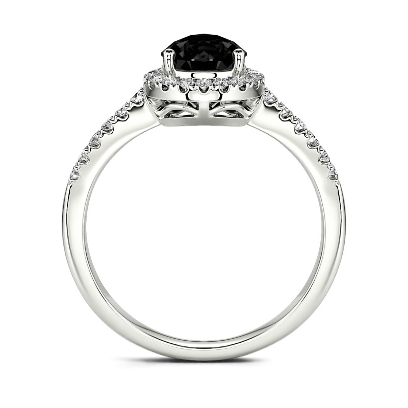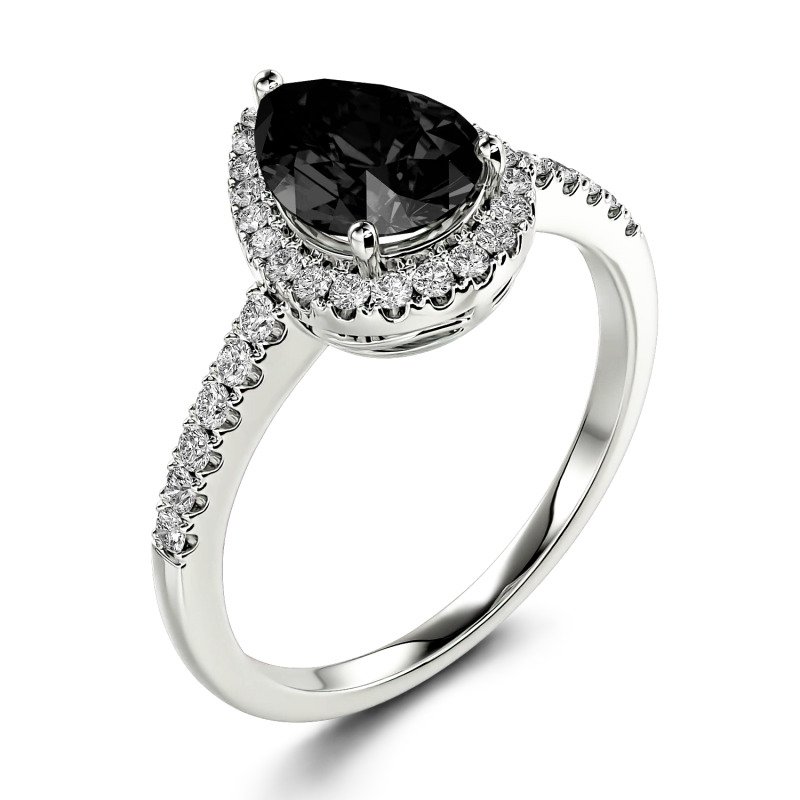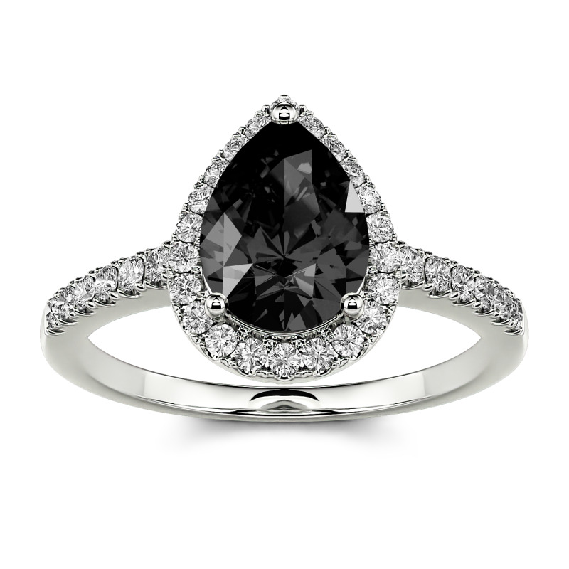 Resplendently styled with a pear-cut center stone, the moissanite ring is designed to shine from every angle. The glittering centerpiece is complete with a halo of small round stones and shimmering stone-set shoulders, which enhance the brilliance of this chic design. Infused with elegance and effulgence, it enriches your lady’s beautiful look and charming personality. Make it a perfect engagement ring and honor your flaming love.
