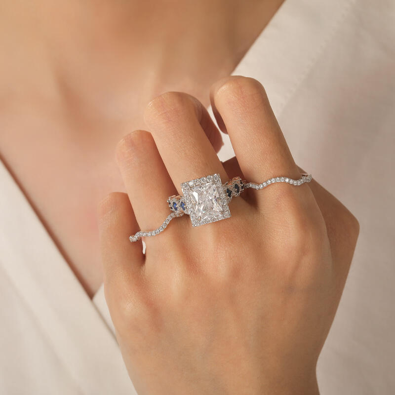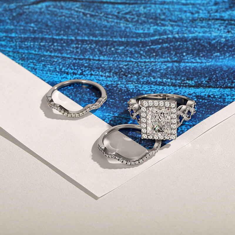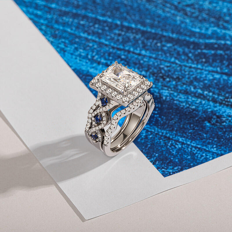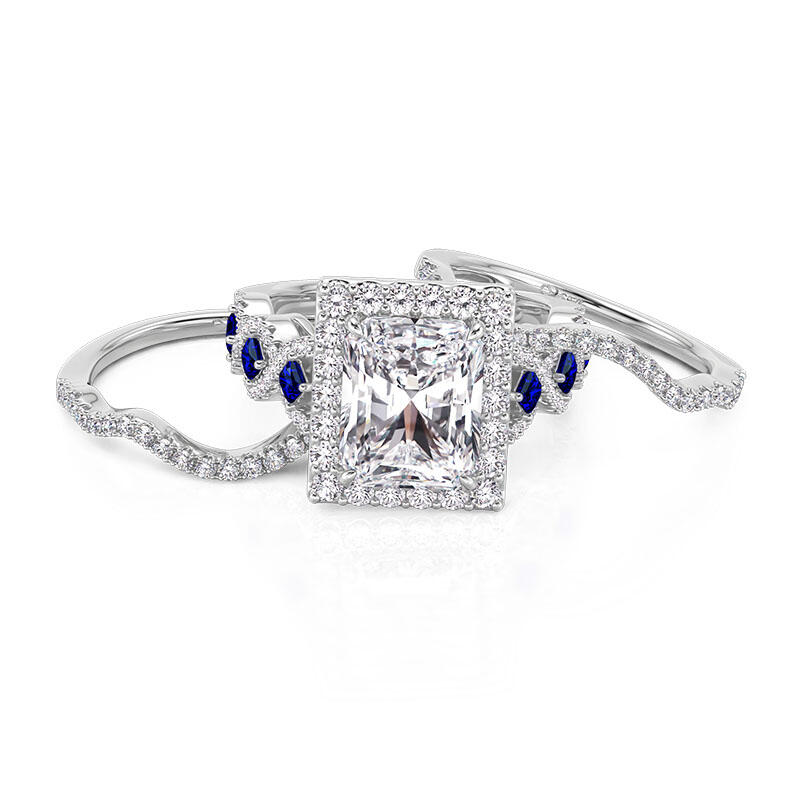 This Jeulia 3pcs radiant cut bridal ring set is a paragon of elegance and luxury, perfect for your special day. At the heart of the set is a resplendent radiant cut centerpiece, its multitude of facets catching and reflecting light with unparalleled brilliance.Surrounding the central gem are princess cut blue stones, adding a touch of color and sophistication.The accompanying bands are adorned with a dazzling array of smaller stones, meticulously set to enhance the overall sparkle. Crafted from high - quality sterling silver, each piece in this bridal ring set not only showcases exquisite craftsmanship but also offers durability. Whether it's your wedding day or an anniversary celebration, this bridal set is sure to make a statement and become a cherished heirloom.
