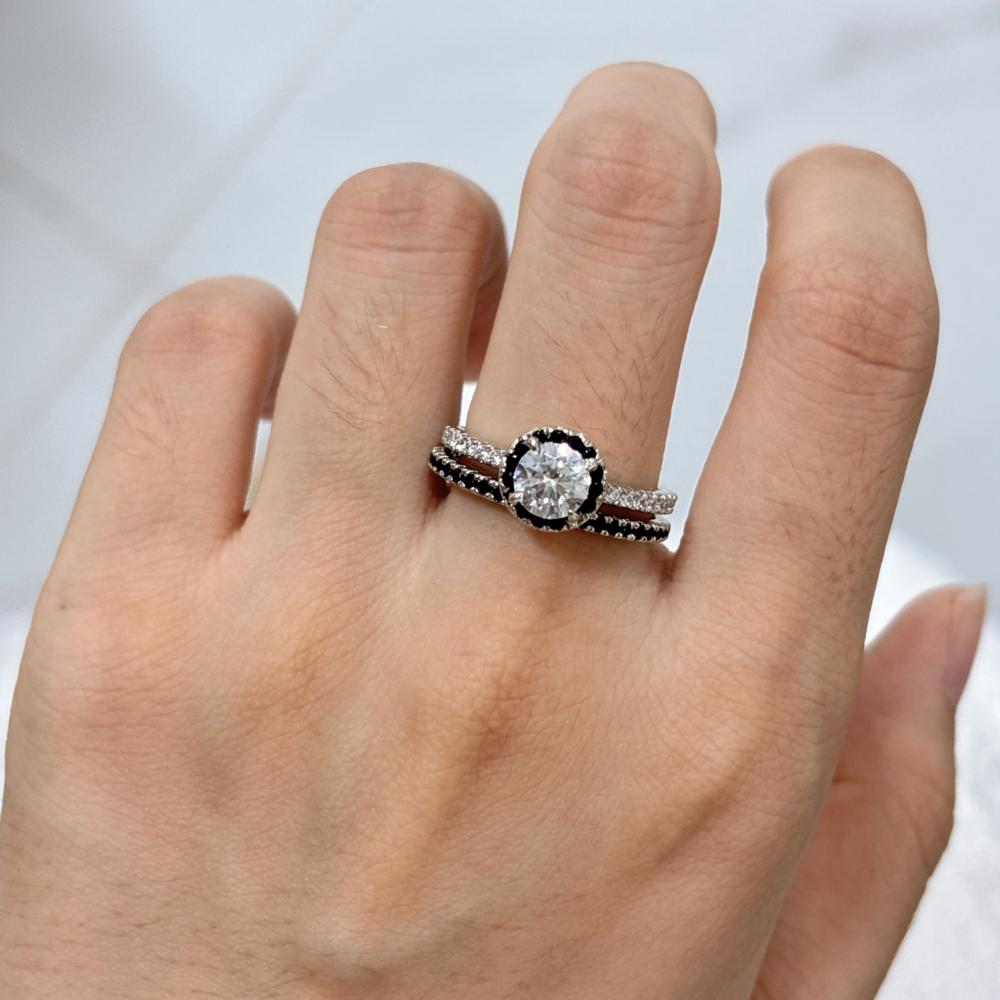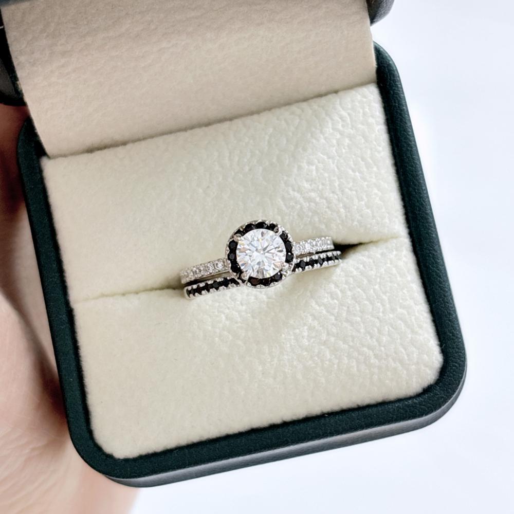 Celebrate your love with the Jeulia round cut halo engagement ring set with Black Accents, a set of two minimalist rings. This elegant eternity ring set features a round - cut central stone, with striking black accents adding a touch of sophistication. The set includes two rings that complement each other perfectly, allowing you to wear them together or separately for different styles. Whether you're exchanging vows on your wedding day or adding a touch of elegance to your everyday look, this halo ring set is the perfect choice.