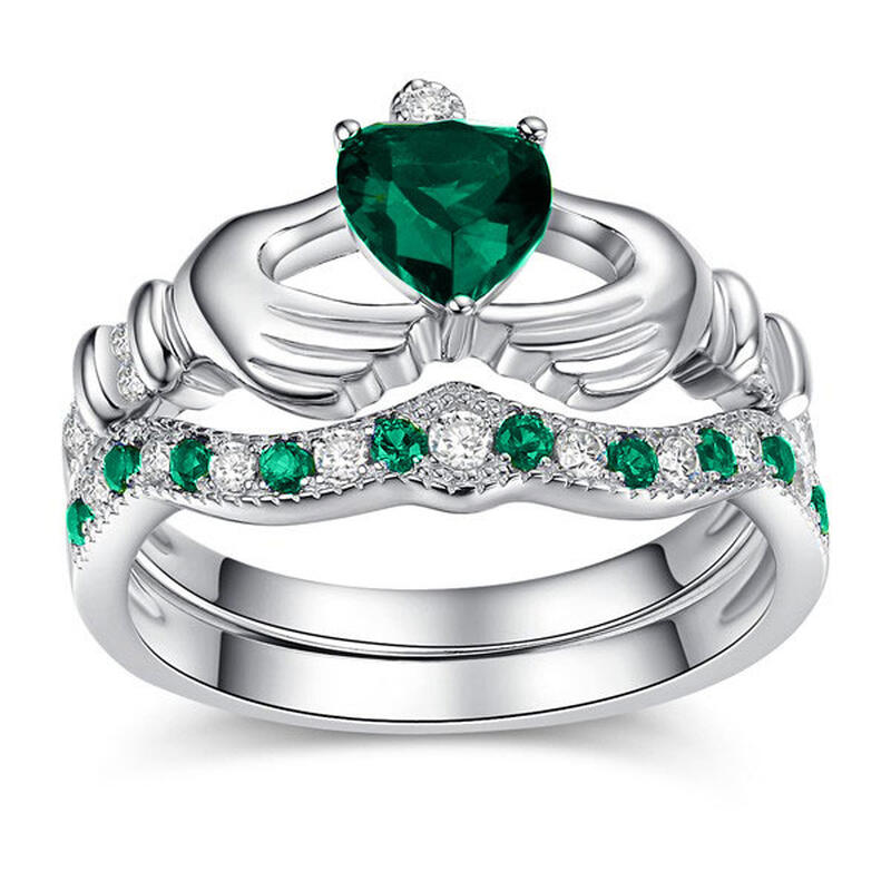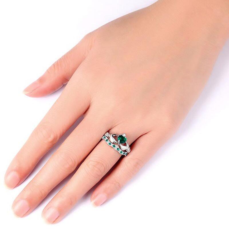 Jeulia Heart Cut Sterling Silver Claddagh Ring Set