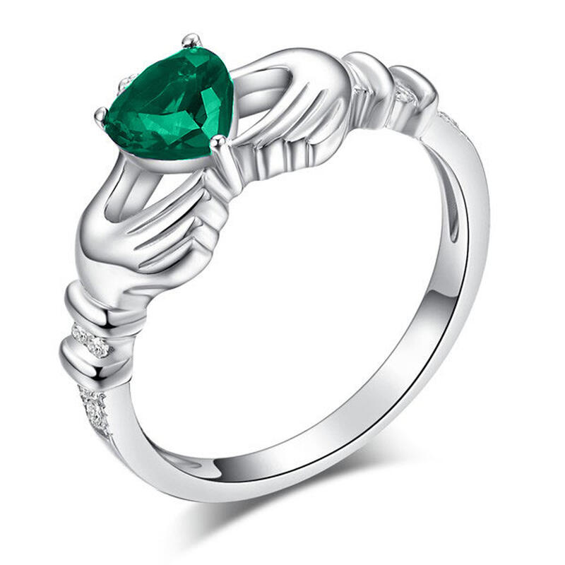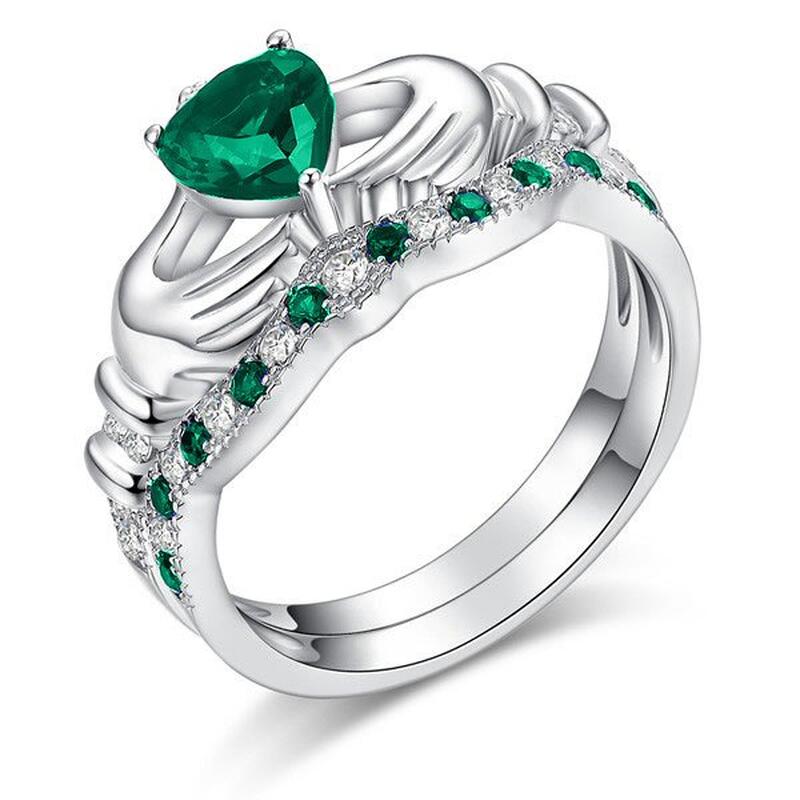 Celebrating love, beauty and loyalty, this claddagh ring speaks right to her heart. Fashioned in sleek sterling silver, this traditional claddagh ring is centered with a green heart-shaped stone. A meaningful token, the hands represent friendship, the heart represents love and the crown represents loyalty. On your wedding day, a coordinating shimmering band complements the meaningful design. This claddagh bridal set is certain to be treasured.