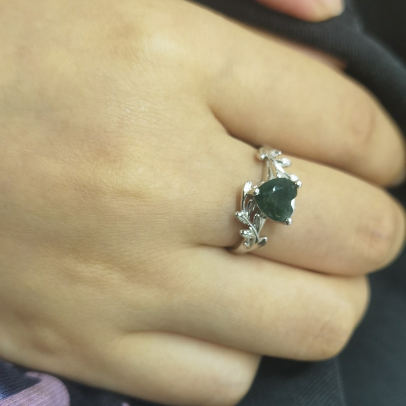 This Jeulia Heart Shaped Moss Agate Engagement Ring – a sizing-free ring with an adjustable band that gently yields to your touch – features a heart-shaped moss agate veined with untamed woodlands, resting atop a band adorned with pavé-set white zircon sprigs. The branch band twists like wild ivy, its leaves micro-engraved with latitude 50.4501° N (Kyiv’s courage). Zircon "dew" glints at leaf tips—proof that even wild hearts gather morning light.