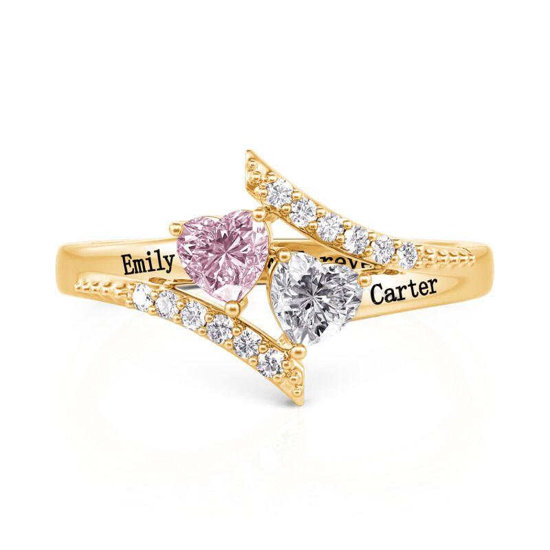 This custom double Heart engagement ring features a unique double heart design that symbolizes the close union of two hearts. The symmetrical wave shape on the top and bottom portions elegantly outlines the sense of flow and adds to the overall dynamic beauty of the custom ring. The special feature of the classic heart ring is the customizable stone color, which allows each couple to choose the color with the most personal touch. The double heart engagement ring can also be engraved with exclusive names, making it a unique testament to love. Whether as an engagement ring or a gift to commemorate love, it will be the perfect choice to express deep love and commitment.