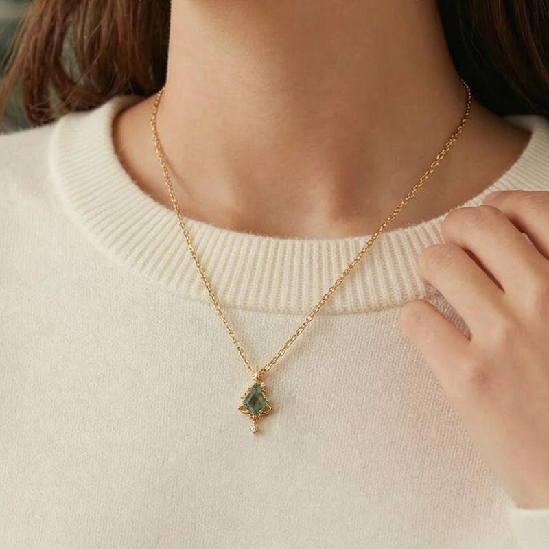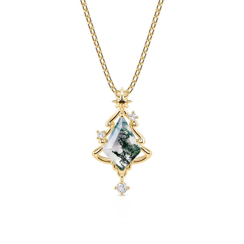 Celebrate the joy of the season with the Jeulia Festive Tree Kite Moss Agate Necklace. Crafted from high-quality sterling silver, this charming necklace features a gorgeous moss agate in the shape of a Festive tree, embodying the spirit of festivities. The natural green hues of the moss agate are beautifully highlighted by a delicate gold outline, while sparkling accent stones add a touch of elegance. This unique necklace is perfect for holiday gatherings or as a thoughtful gift for loved ones. Wearing the Jeulia Holiday Tree Necklace allows you to carry a piece of festive cheer with you, making it a delightful symbol of joy and celebration that can be cherished for years to come.