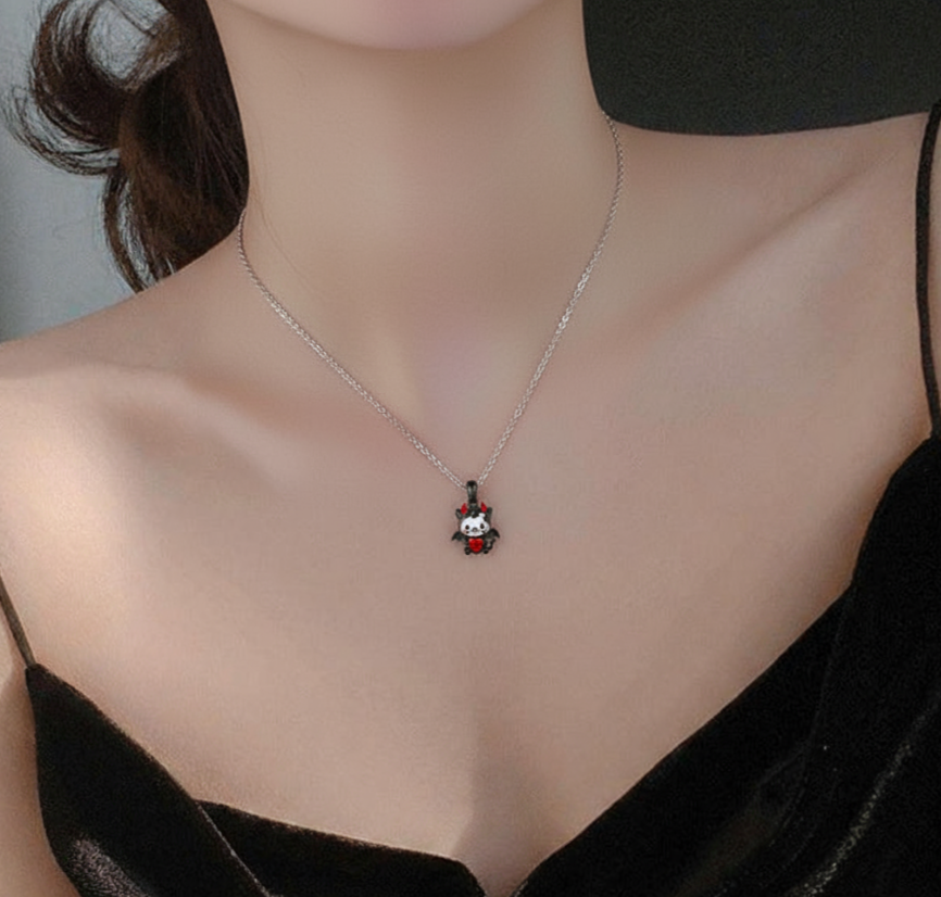 A mischievous cat with crimson horns and speckled wings cuddles a 4mm red heart gem, its playful Gothic charm amplified by subtle skull-and-bow accents. This Jeulia Hug Me Little Devil Red Heart Necklace celebrates rebellious sweetness. It's where dark whimsy meets heartfelt affection, for souls who charm with a hint of mystery.