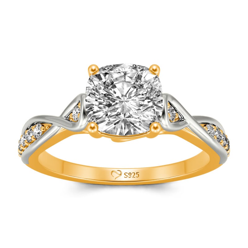 With grace and shimmer, this sparkling ring is a classic style that complements her sophisticated taste. A cushion cut stone shimmers at the center of this design, while additional stones are surrounded in infinity symbol-shaped frames. Crafted with meticulous attention to detail, this ring allows you to customize both the color of the stone and the metal, ensuring a truly personalized expression of your unique style. This elegant and timeless look blends sophistication with radiance and sparkle.