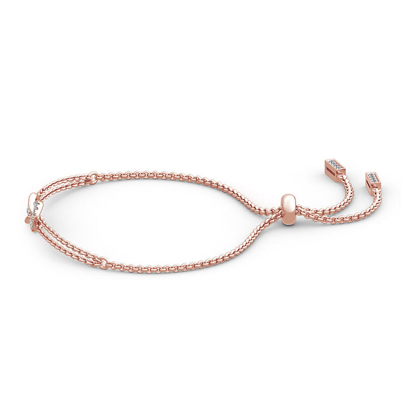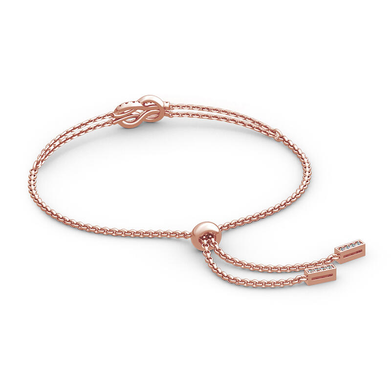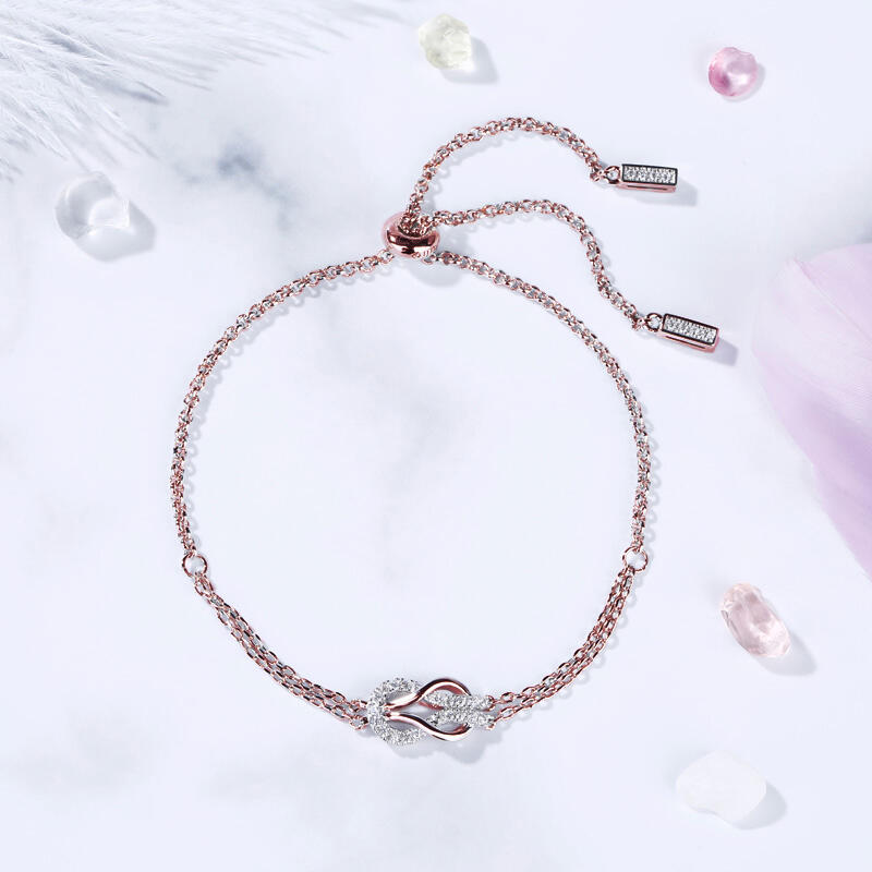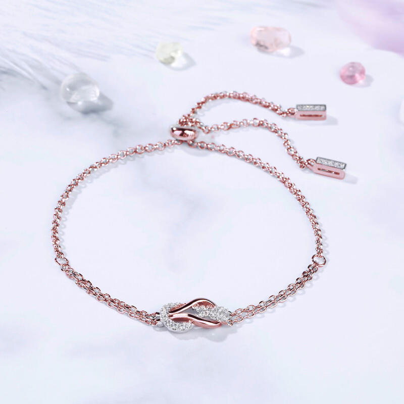 A brilliant way to show her your love is forever, this dainty bracelet will certainly touch her heart. This meaningful design showcases two ribbons interlocked for a infinity symbol-shaped look, while shimmering round stones add eye-catching sparkle to the design. This elegant bracelet makes a stunning statement of everlasting love. A great anytime choice, this fashion bracelet is sure to become an instant favorite.