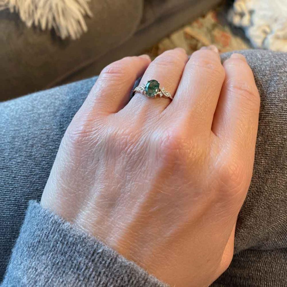 The Jeulia Infinity Oval Moss Agate Engagement Ring is a unique and captivating piece that beautifully blends nature-inspired design with elegance. This infinity ring features a stunning oval-cut moss agate stone, characterized by its rich patterns that evoke the beauty of the natural world. The infinity band design symbolizes eternal love and commitment, elegantly intertwining to create a graceful flow. Accented with sparkling stones on either side of the moss agate, this nature inspired ring enhances its overall brilliance and charm. Crafted from high-quality sterling silver, this moss agate ring is perfect for those who appreciate distinctive jewelry that tells a story, making it an ideal choice for engagements or special occasions. It's a beautiful representation of love that is both timeless and contemporary.