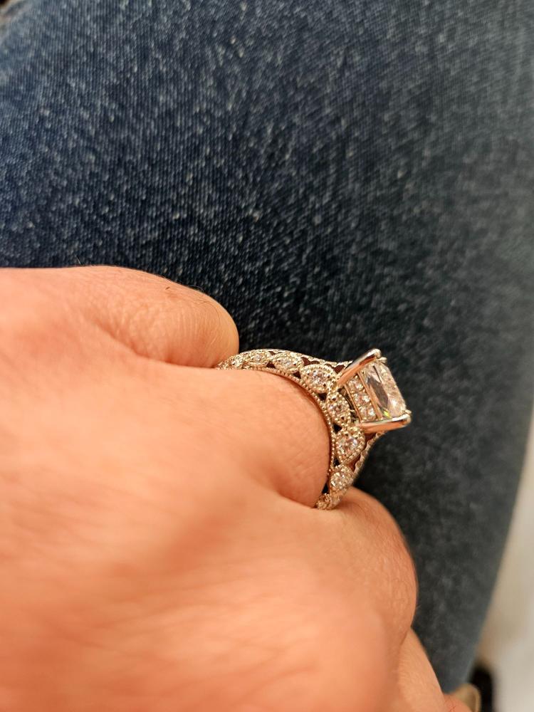 This eye-catching interchangeable ring set features an enchanting radiant cut stone and rows of smaller stones embellish the engagement ring in profile. Milgrain detailing along the ring's shank adds depth and dimension to this elegant design. Additional stones are set into the matching band. Gleaming with your love, this slender wedding set is a true reminder of your everlasting love.