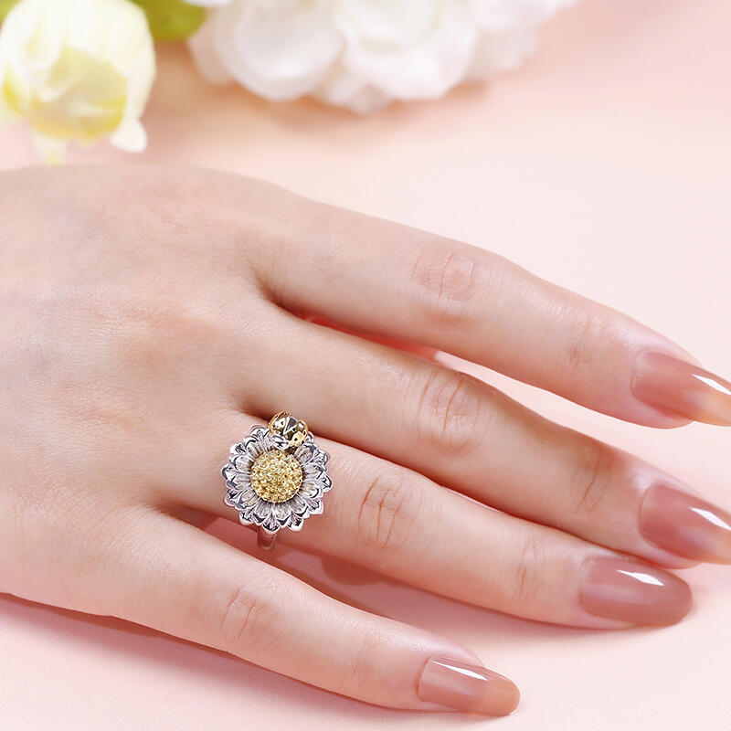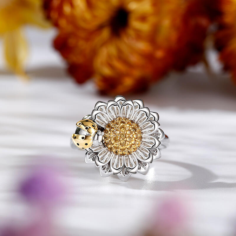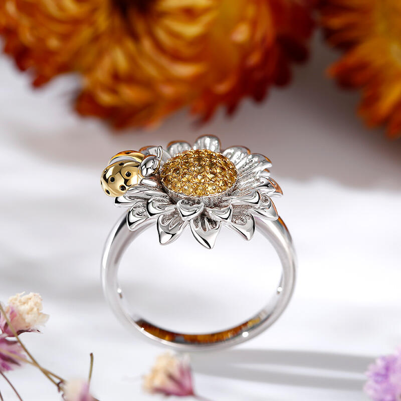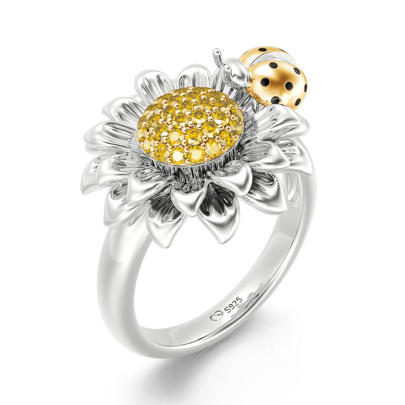 This flower and ladybug ring reminds us of the arrival of spring and of the return of our favorite insects. As a metaphor of the arrival of spring, this ring will bring a touch of freshness to your look. Perfectly capturing a moment in time with beautiful detail our ring depicts a golden ladybug gathering pollen from a daisy.