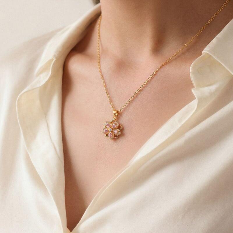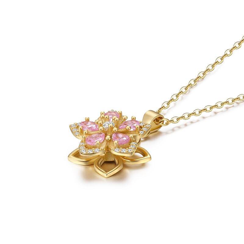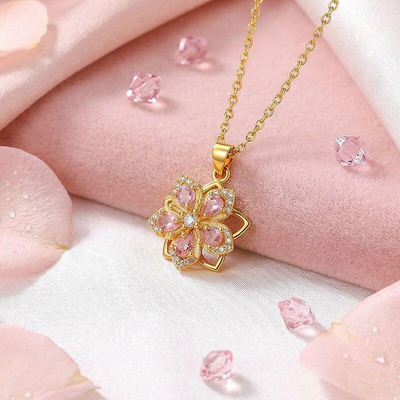 This Jeulia whimsical floral necklace features a unique two-layered spinner design, crafted in polished gold-plated sterling silver. At its core, a delicate flower with pink pear-cut petals and a sparkling round center stone spins freely within a geometric star-shaped frame, creating captivating movement and dimension. The flower's petals are elegantly framed by a pavé halo, adding luminous sparkle with every turn. Perfect for nature lovers and those who appreciate playful versatility, this fidget necklace blends intricate floral artistry with modern spinner functionality—a standout accent for everyday wear or special moments.