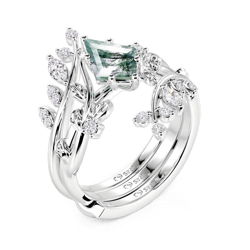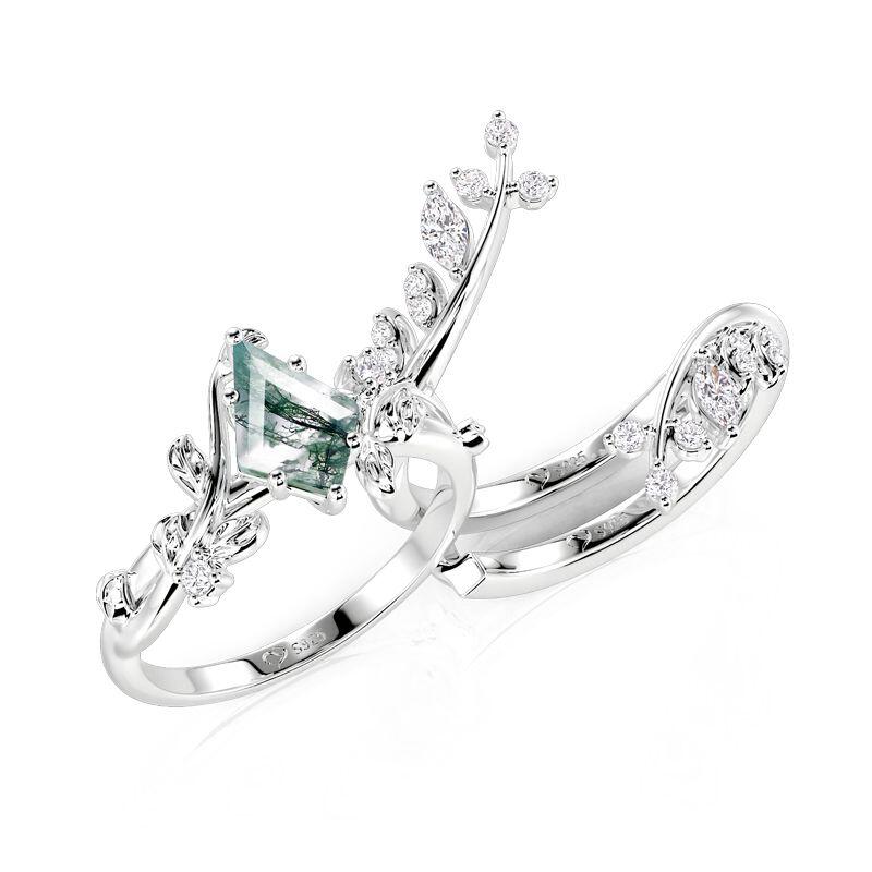 Immerse yourself in organic elegance with this Jeulia two-piece bridal ring set, centered on a kite-cut moss agate that displays unique, forest-inspired patterns. Encircled by delicate leaf and branch motifs, the design is further adorned with sparkling stones that evoke gentle dewdrops on foliage. Layer the two bands together to build soft texture and earthy radiance, blending woodland charm with timeless sophistication. Ideal for daily wear or meaningful moments, this moss agate engagement and wedding ring set carries the serene beauty of nature in every graceful detail.
