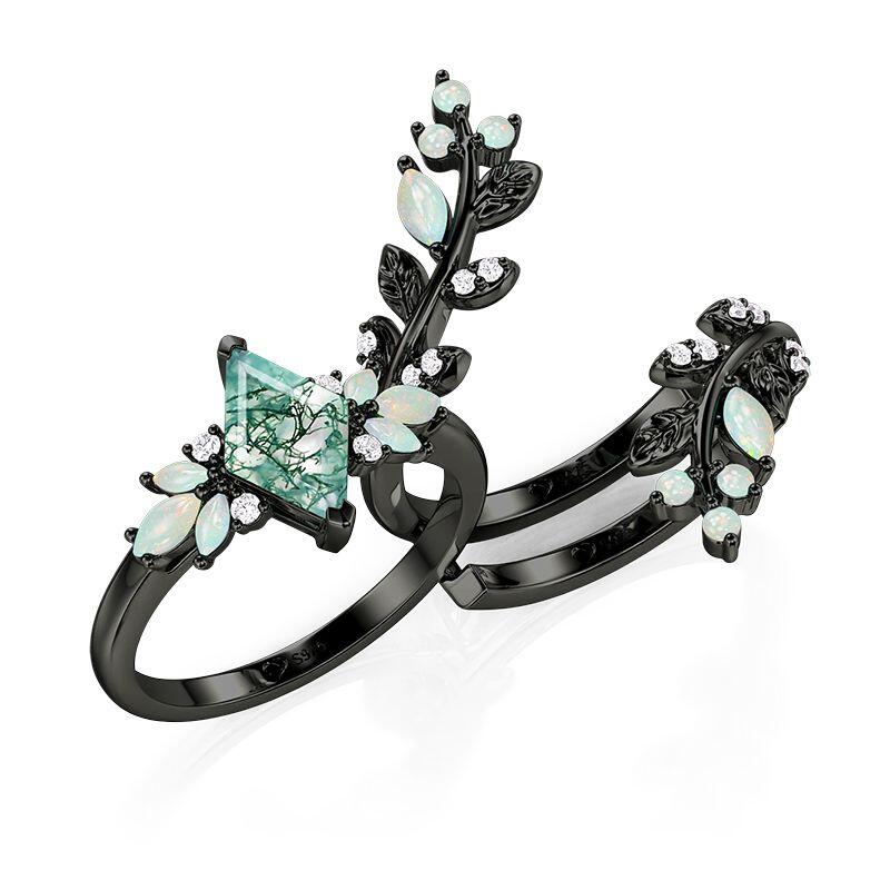 Dive into nature-inspired luxury with this Jeulia 2pcs bridal set. Centered around a striking rhombus cut moss agate, its earthy patterns are embraced by intricately twisted leaf and branch motifs, further adorned with opal accents that emit an iridescent glow. Crafted in lustrous black plating, this nature inspired ring set artfully blends botanical charm, the unique allure of moss agate, and the soft shimmer of opal—ideal for ones seeking nature-forward elegance. Stack the two bands for layered, woodland-inspired sparkle that’s as whimsical and refined for wedding days as it is effortless for daily wear.