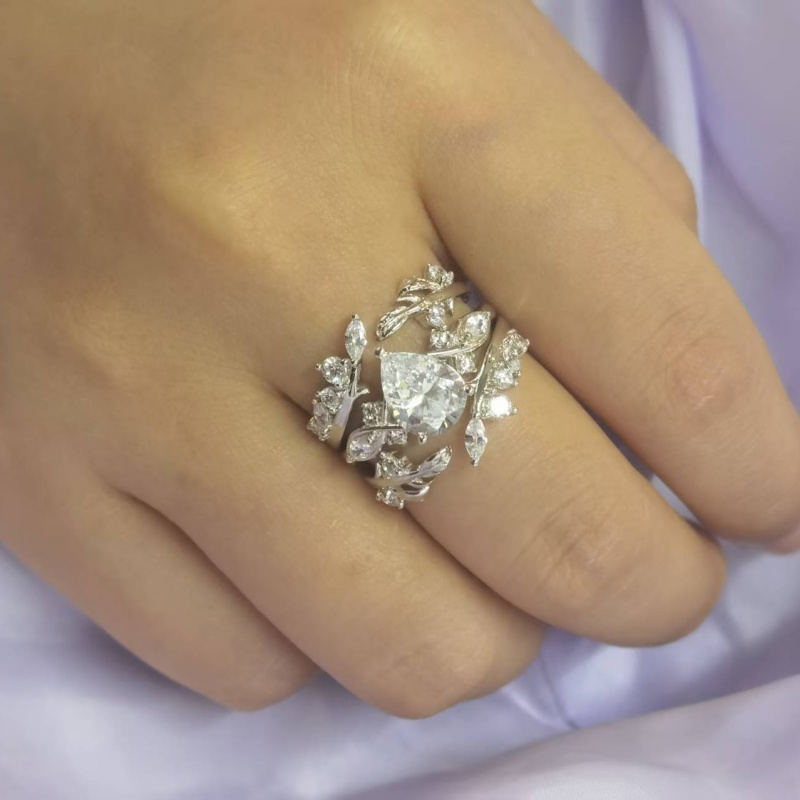 The Jeulia Nature Inspired Pear Shaped Ring Set showcases a pear-cut zircon centrally mounted with sterling silver vines in a helical embrace, where marquise and round zircons are prong-set atop the vine leaves, evoking morning dew glistening on silk threads. The enhancer band weaves oxidized leaf silhouettes beneath—stack to transform light into dappled forest glare, or detach for minimalist clarity. Frosted prongs mimic morning fog, softening the stones’ fire into woodland magic.