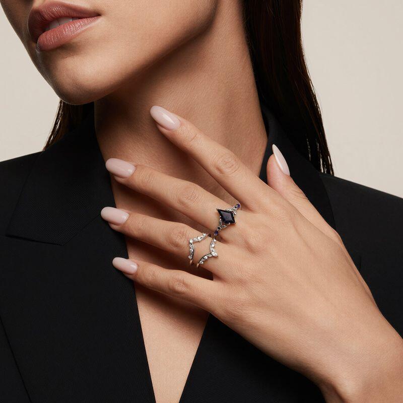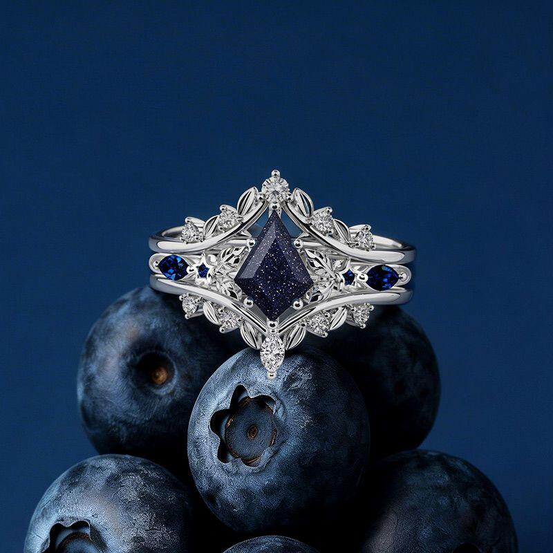 The Jeulia Leaf Wrap Kite Cut Blue Sandstone Engagement Ring Set evokes woodland elegance with a touch of celestial mystery. At its center, a deep blue sandstone stone displays subtly shifting sparkle, while the wrap-style bands curve like intertwining leaves to cradle the center gem. Accented with marquise and round clear stones and small blue accents along the shoulders, the design balances organic motifs with refined brilliance. Crafted for both visual impact and comfortable wear, this leaf ring set makes a distinctive engagement choice—perfect for someone who loves nature-inspired detail, unique color, and a romantic, storybook aesthetic.