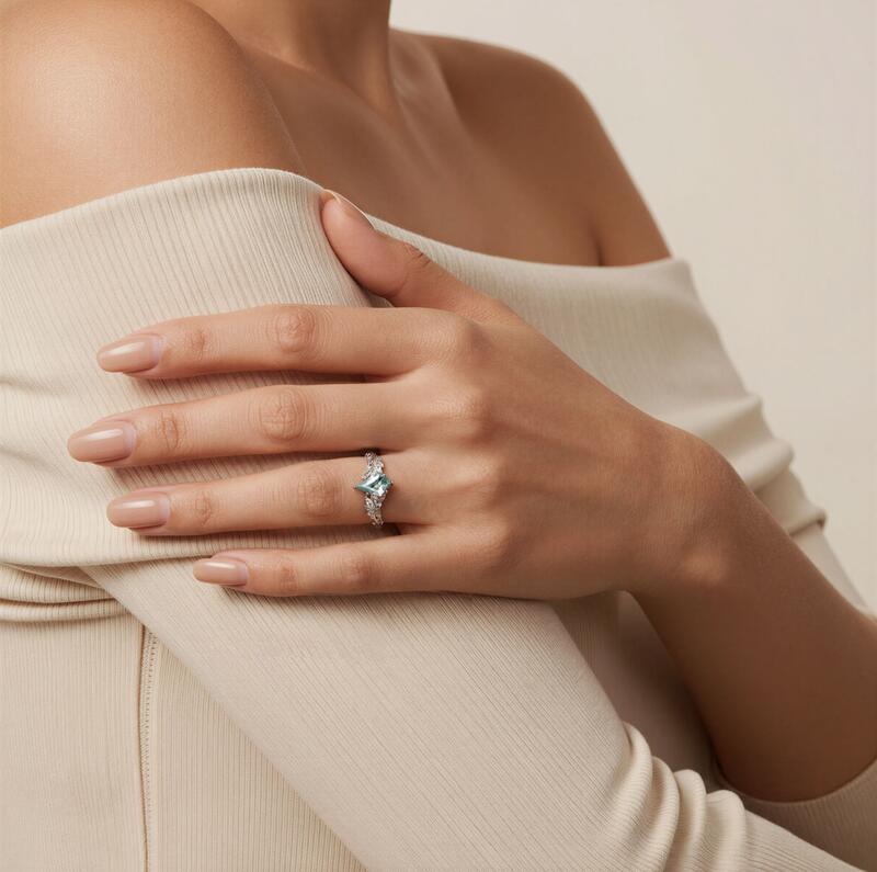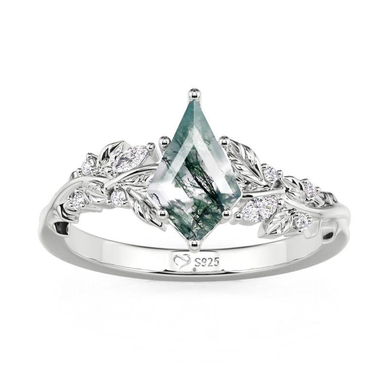 This Jeulia Leaf-Wrapped Kite Cut Moss Agate Engagement Ring is meticulously crafted from sterling silver, poetically blending the natural wonder of kite-shaped moss agate with the vitality of plant vines. The kite-cut moss agate center stone boasts sharp, defined edges, while its natural cloud-like moss patterns reveal a misty, forest-dawn beauty under light. The shank weaves fluid twists into delicate foliage and resilient thorn branches. Micro-diamonds along the leaf edges mimic morning dewdrops, while oxidized thorn tips enhance dimensionality. This interplay of softness and strength cradles the center stone, as if guarding a treasure embraced by nature. The overall design radiates primal wild beauty and intricate artistic ingenuity, perfect for newlyweds who seek unique individuality and natural aesthetics. Let love settle like moss traces over time, and endure like thorns through the years.