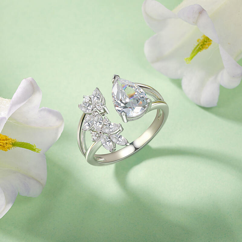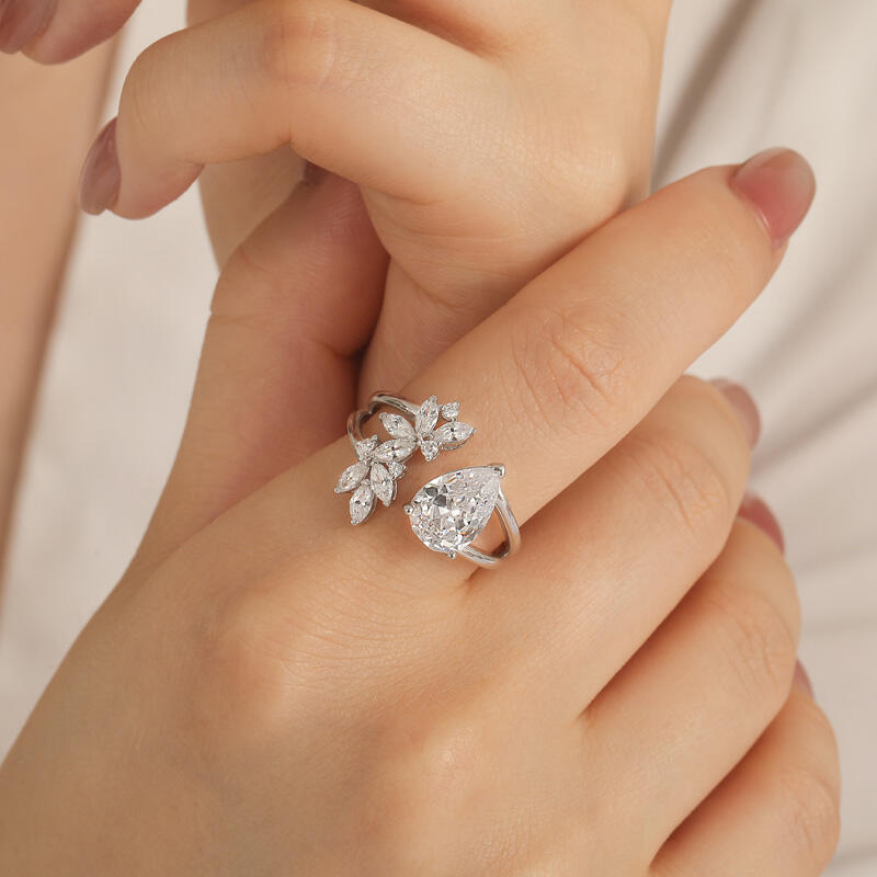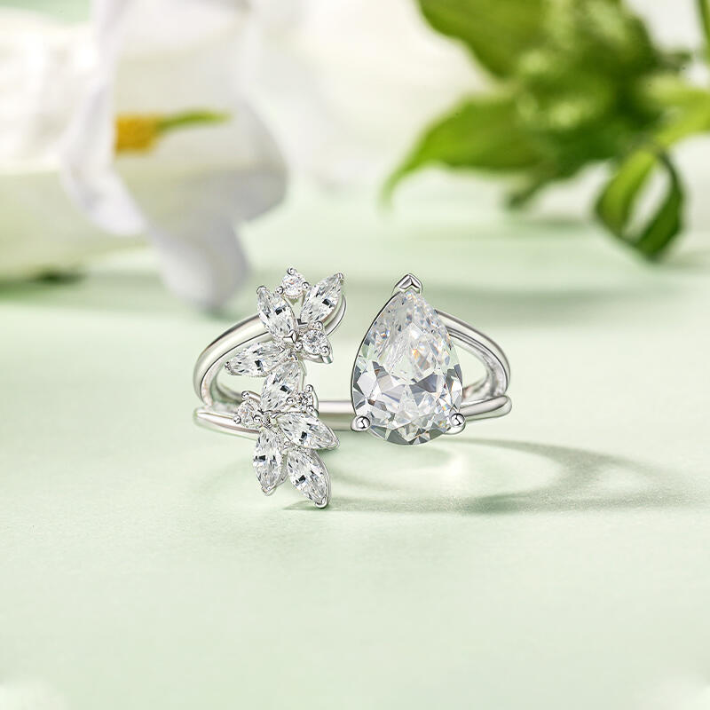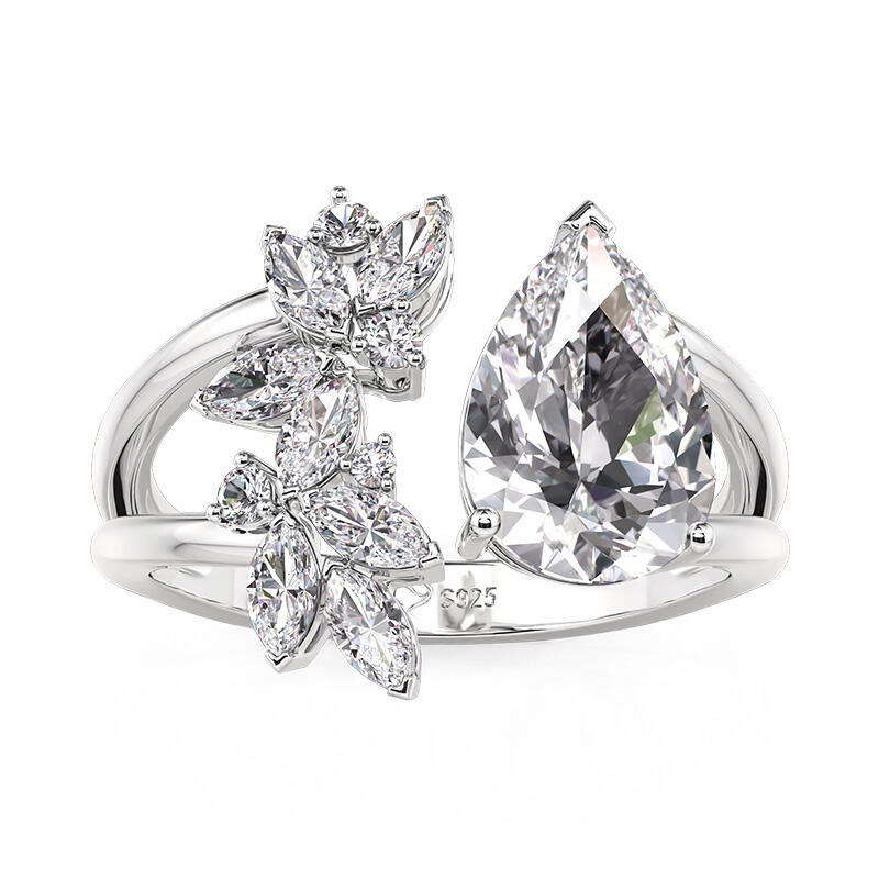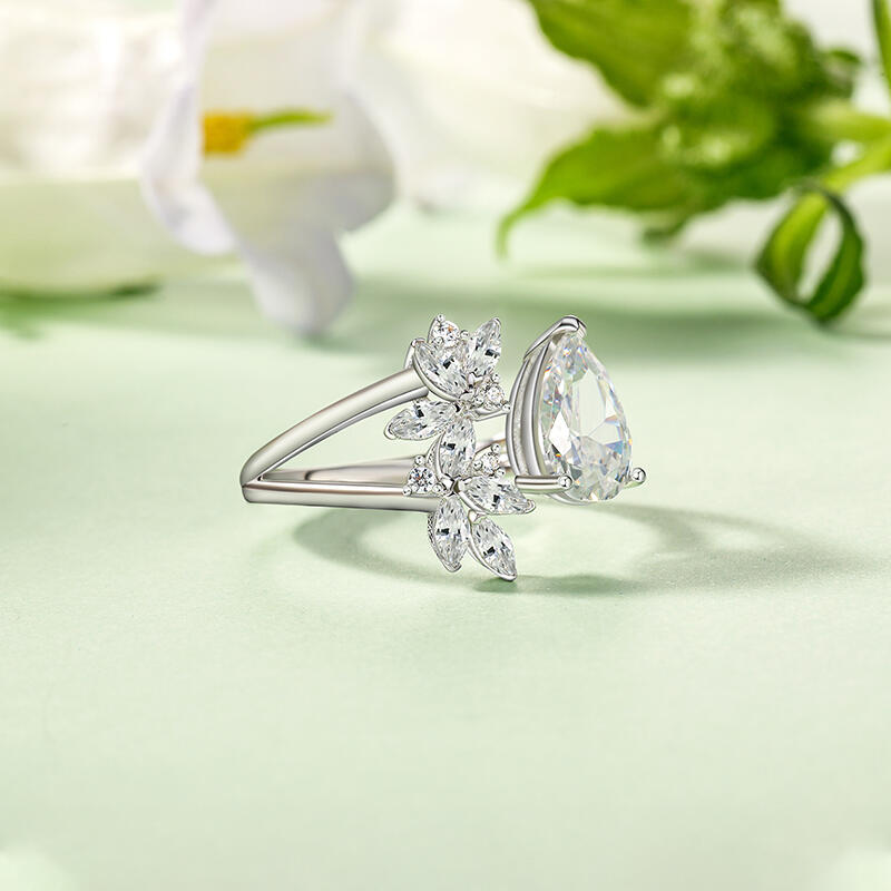 This unique leaves cluster ring with sterling silver and pear cut design features a stunning open design. On one side of the opening, a large pear-shaped center stone catches the eye with its elegant cut and rich, captivating hue. On the other side of the opening, a cluster of marquise-cut stones are intricately arranged in the shape of a graceful leaf. The cluster design not only adds visual interest but also embodies the organic charm of foliage. Crafted with meticulous attention to detail, this leaves open cluster ring is a testament to the artistry of fine jewelry, blending timeless design with contemporary appeal.